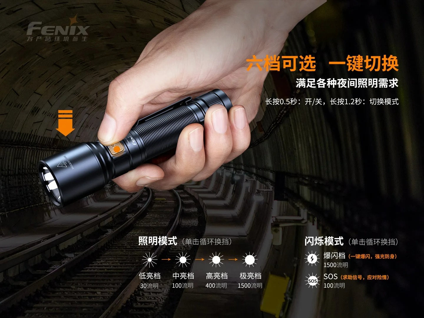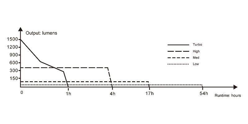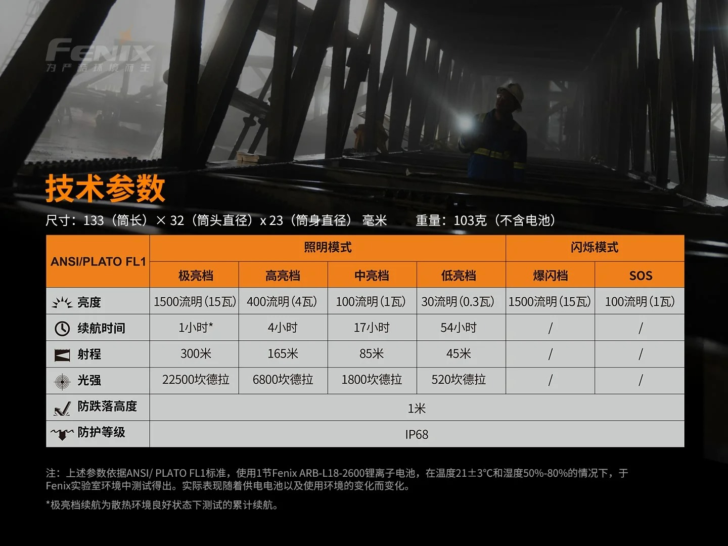 注:上述參數依據ANSI/ PLATO FL1標準,使用1節Fenix ARB-L18-2600鋰離子電池,在Fenix實驗室環境下測試得出,實際表現隨著燈具、供電電池以及使用環境的變化而變化。