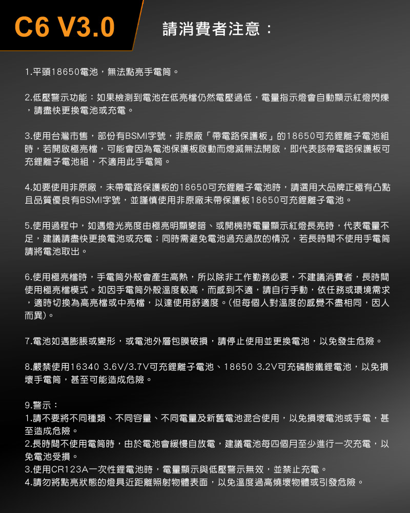 *18650/16340鋰離子(Li-ion)電池屬於工業電芯,並非有安全保障的民用電池,當電池品質不良或者使用不當(短路、高溫等等)時可能發生燃燒、爆炸並危及人身和財產安全,若使用此電池種類應明白其中的風險並自願承擔相應的責任。使用品質優秀並帶有保護電路的鋰離子電池會在一定程度上降低風險。