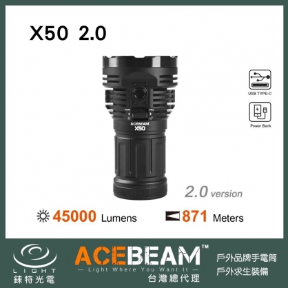 X50 2.0 世界上第一個 PD 移動電源最亮的手電筒,由 3 x 21700 電池組供電。