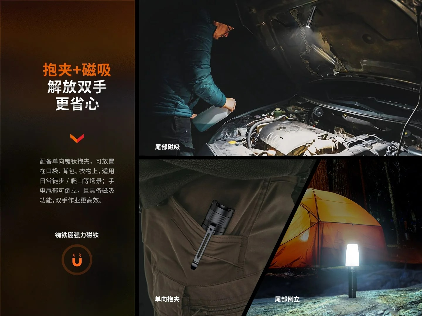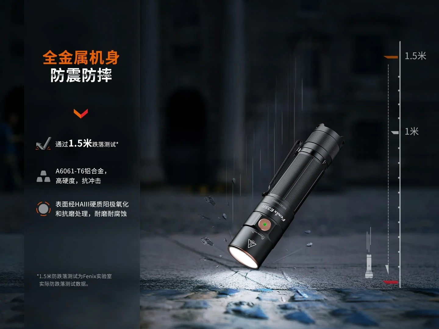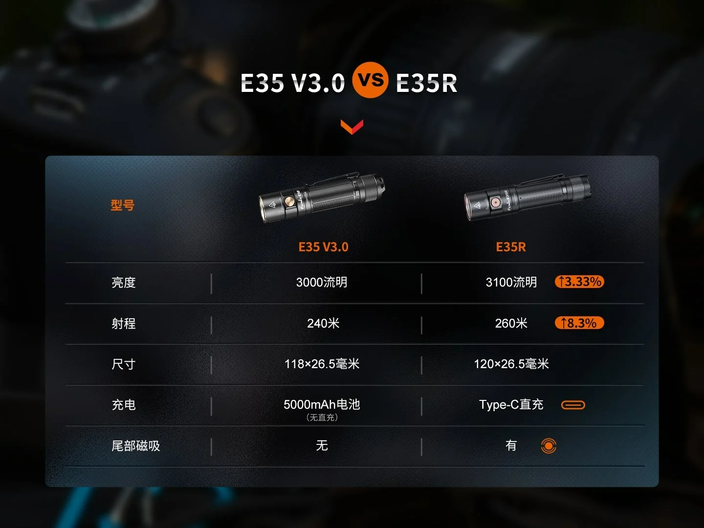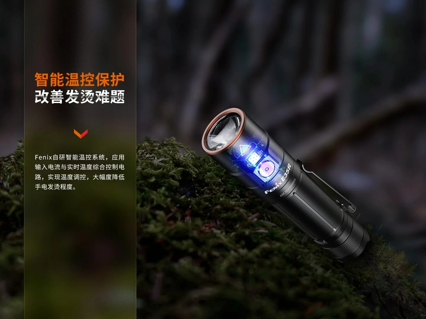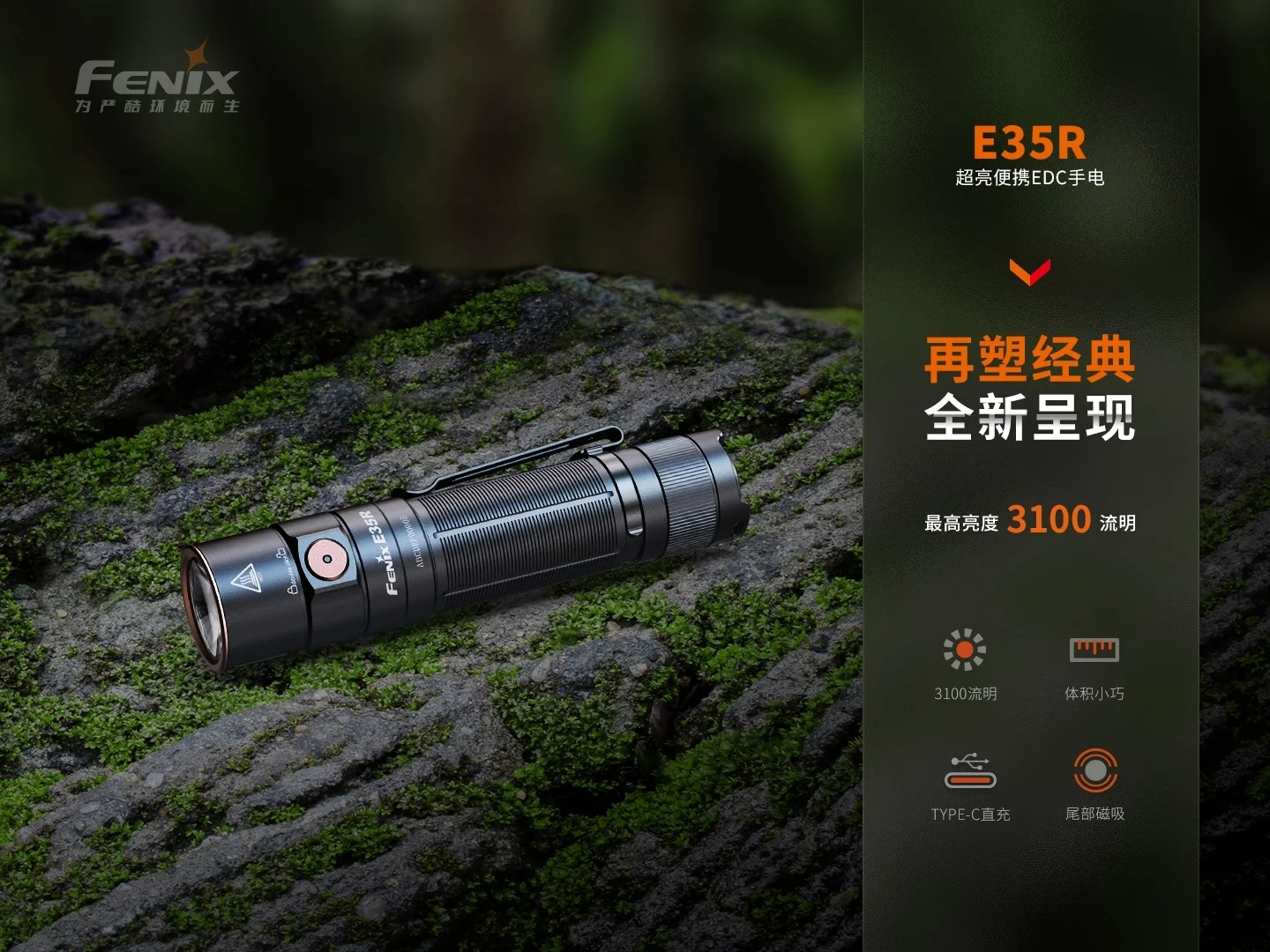 答:Fenix E35R是一款高性能EDC直筒小手電筒,標配一節21700可充電鋰離子電池,最高亮度達3100流明,最遠射程260米。手電筒採用頸部開關,一鍵開關換擋,操作簡單快捷;支持Type-C充電口充電;尾部磁吸功能,檢修作業時可解放雙手。手電筒體積適中,一手把握,配備單向抱夾攜帶方便。加上其耐摔防水性能,全金屬CNC精密加工,品質可靠。適用於日用應急、城市通勤、戶外徒步等多種場景使用。