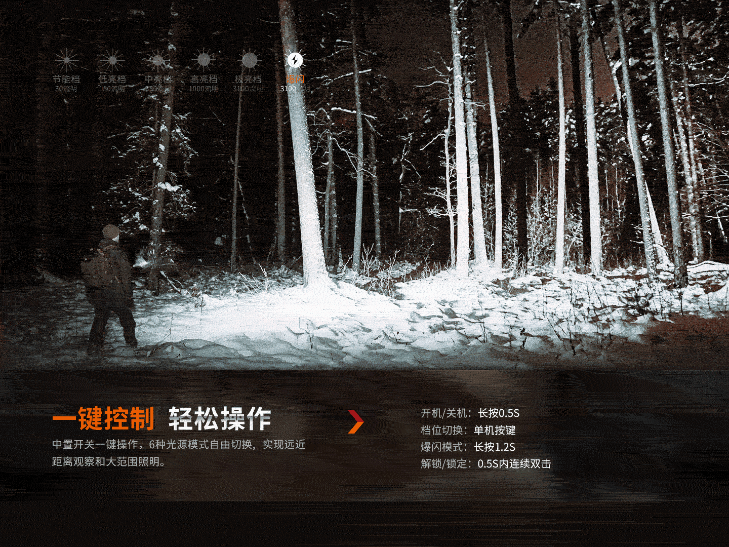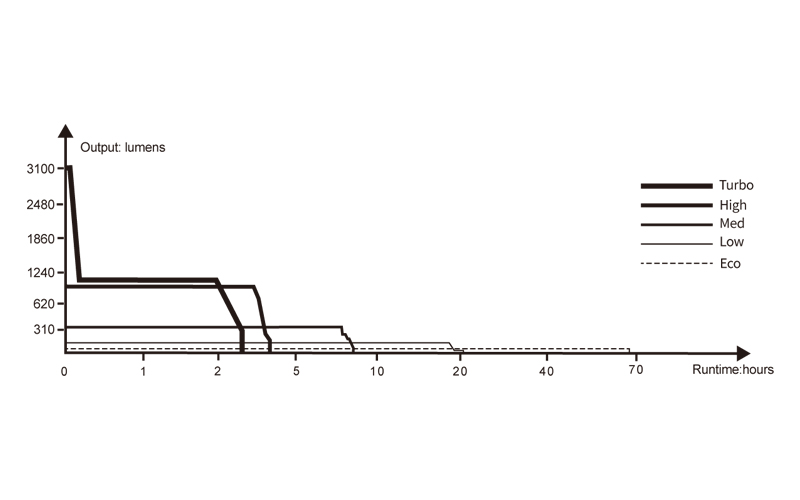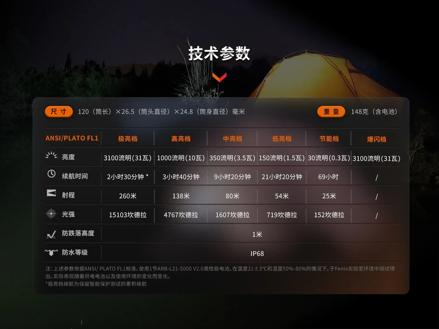 注:上述參數依據ANSI/ PLATO FL1標準,使用1節ARB-L21-5000 V2.0高性能電池,在溫度21±3℃和濕度50%-80%的情況下,於Fenix實驗室環境中測試得出。實際表現隨著供電電池以及使用環境的變化而變化。
