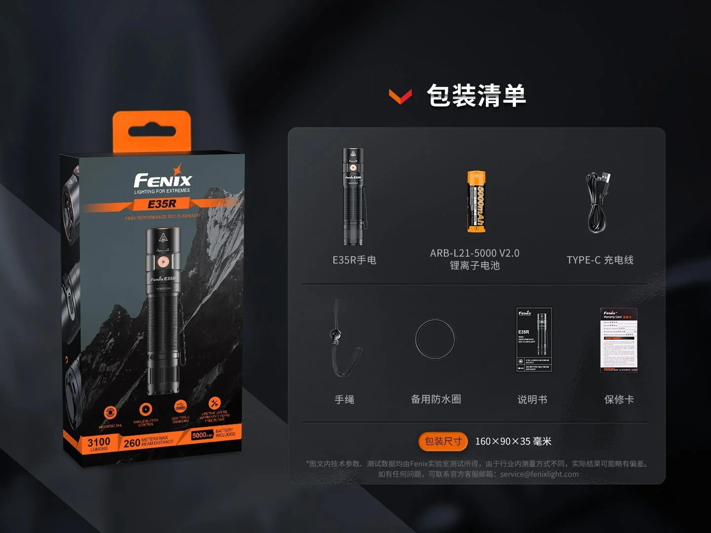 E35R手電筒、Fenix ARB-L21-5000 V2.0鋰離子電池、Type-C充電線、手繩、備用防水圈、說明書、保修卡