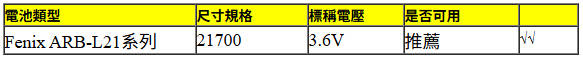 *僅對Fenix ARB-L21系列21700可充電鋰離子電池有效。