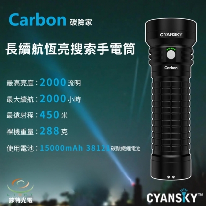 CYANSKY Carbon 碳險家 是一款便攜恆亮搜索的多功能手電筒,最大亮度高達2000流明,最遠射程能達450米,最長續航可達83天。