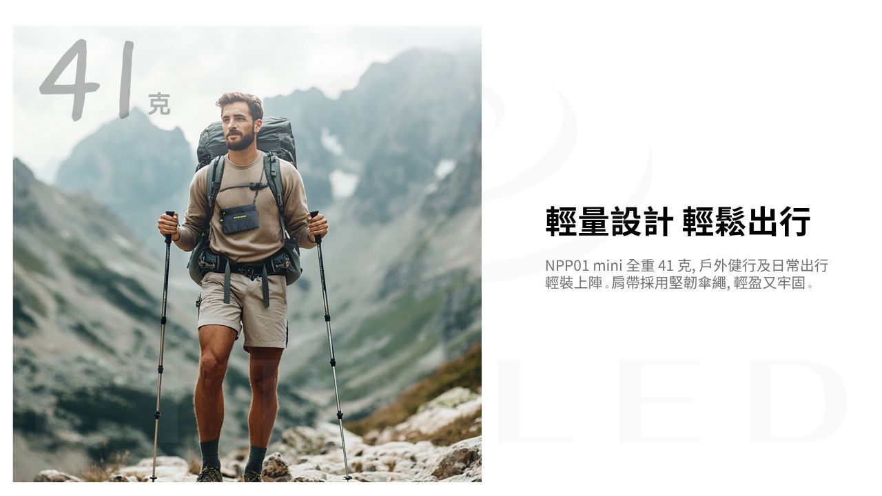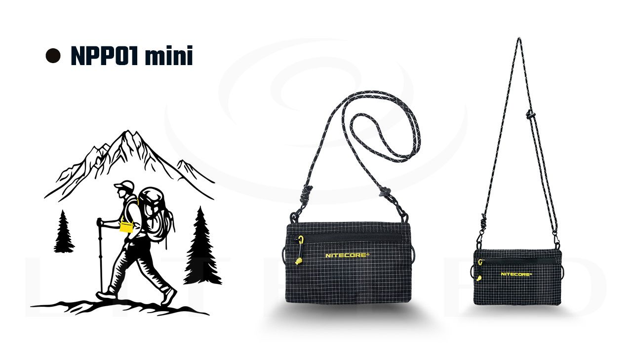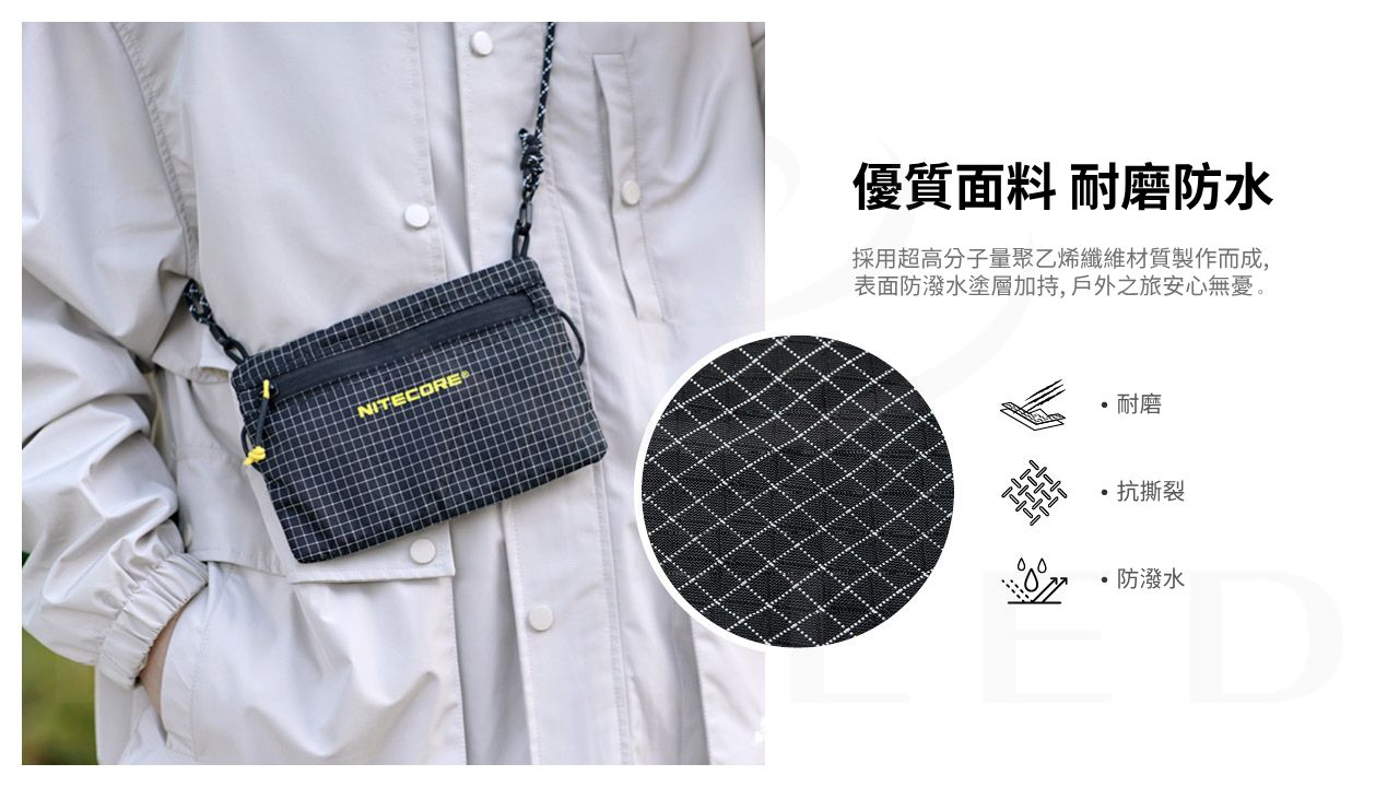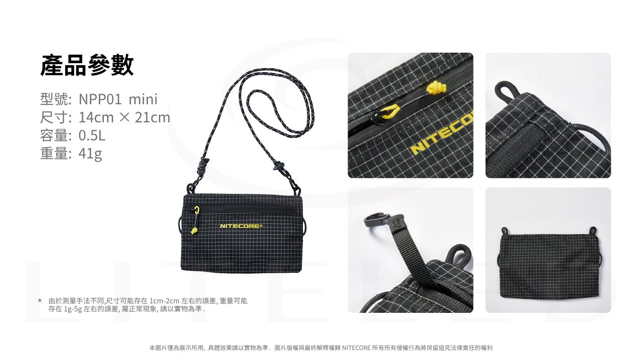 NITECORE NPP01 mini 戶外便攜斜跨包,超高分子量聚乙烯纖維材料製作而成,表面防潑水塗層,0.5L容量,全重41克輕量設計,肩帶採用堅韌傘繩,兩側設有掛載點,可做通勤便攜主包或徒步胸前附包使用,輕便百搭。