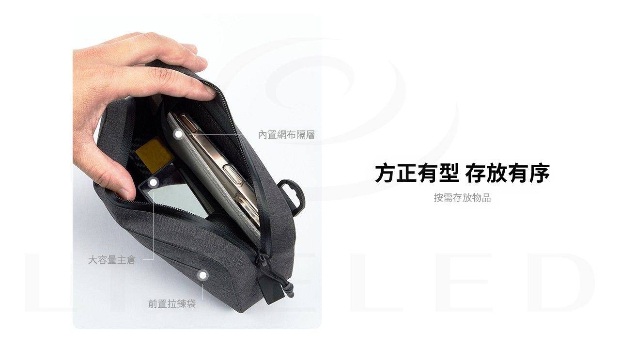 防水小方包,採用900D陽離子複合TPU塗層面料和YKK防水拉鍊,防潑水更安心,1.4L容量,行動電源、手機等日常用品盡收其中,分區設計按需存放,更多細節設計滿足和戶外儲物需求。