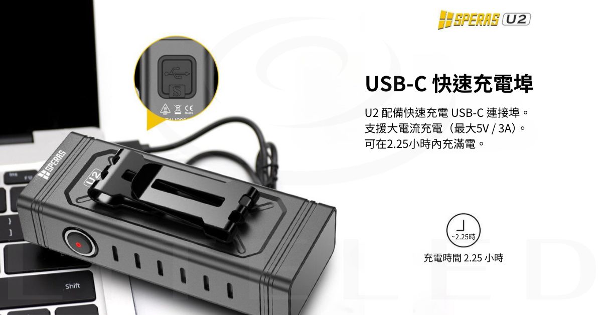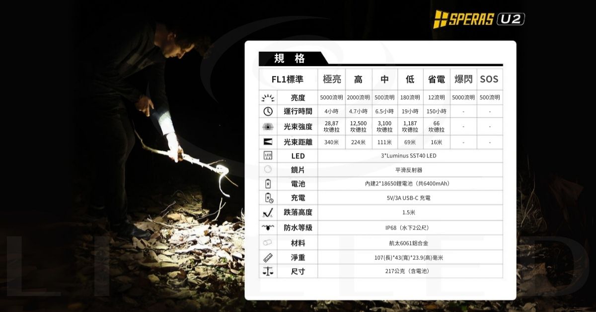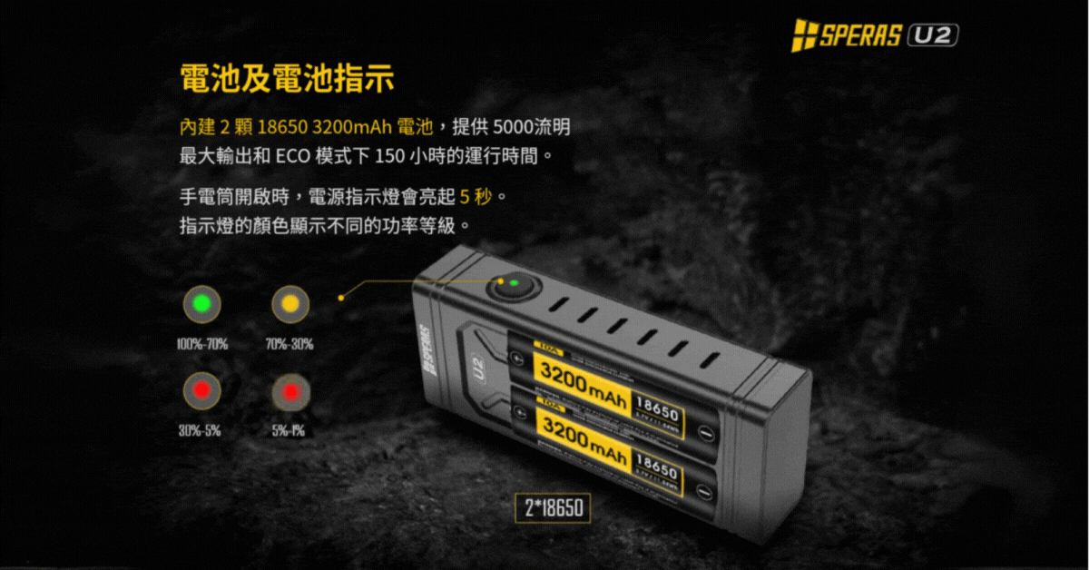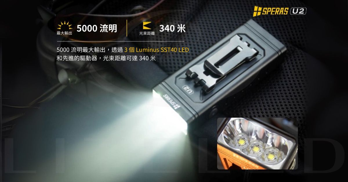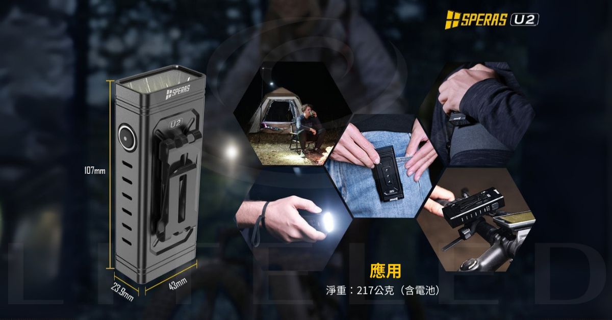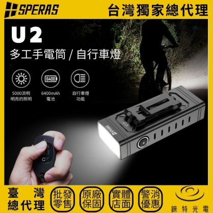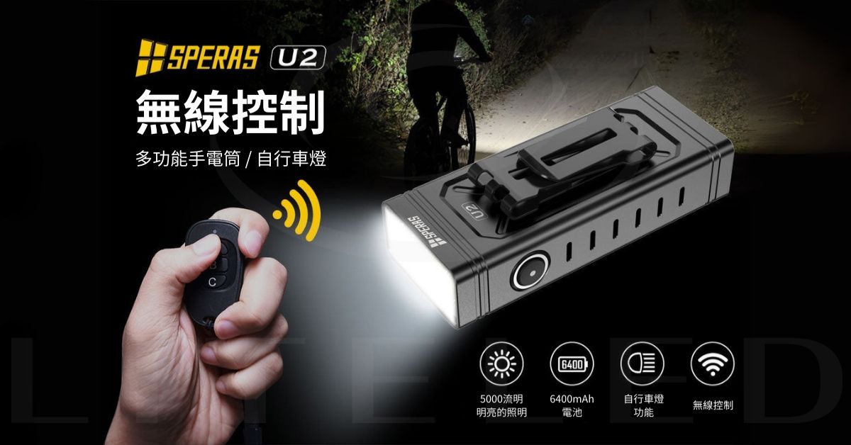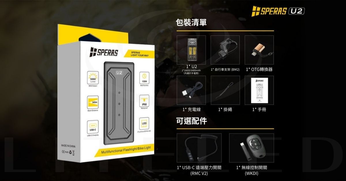 SPERAS U2 是一款多功能手電筒,搭配3個Luminus SST40 燈珠以及先進設計,最強輸出可達5000流明和340米射程。矩形外型兼具實用性、現代感和堅固耐用的外觀,並增強了散熱性能。 USB-C 5V/3A快充,2.25 小時內可充滿。內建兩顆 18650 3200 mAh 電池,續航力超過 150 小時。透過功能齊全的自行車支架,您可以輕鬆地將手電筒安裝到自行車上或從自行車上拆下。此外,它還配備無線 USB-C 遠端壓力開關,可解放您的雙手。 U2 是露營、健行、戶外和日常使用的理想手電筒。
