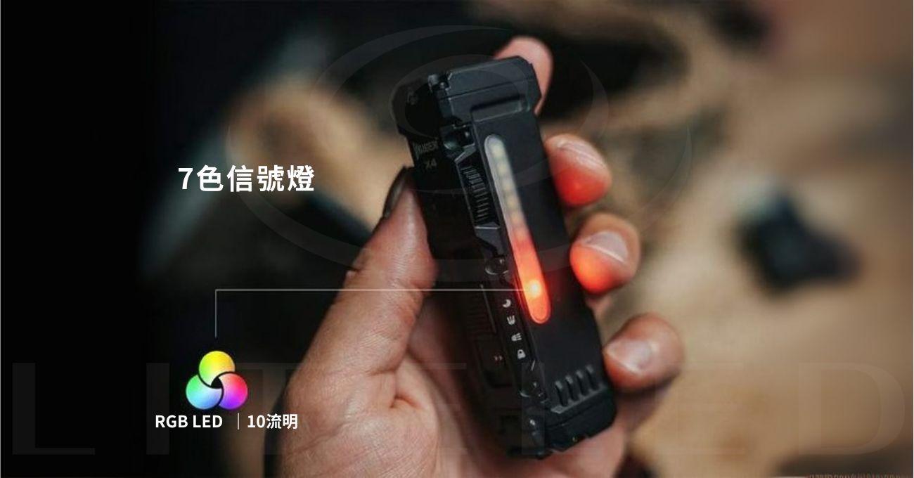 X4 不僅亮度高,更注重多功能性。它內建 10 流明 RGB 燈,您可以透過旋轉撥盤輕鬆切換 7 種鮮豔色彩,非常適合氛圍照明、夜間可視性或創意應用。需要吸引注意力或保障安全?啟動閃爍信號模式,在緊急情況或低光源環境下即可立即獲得可見性。