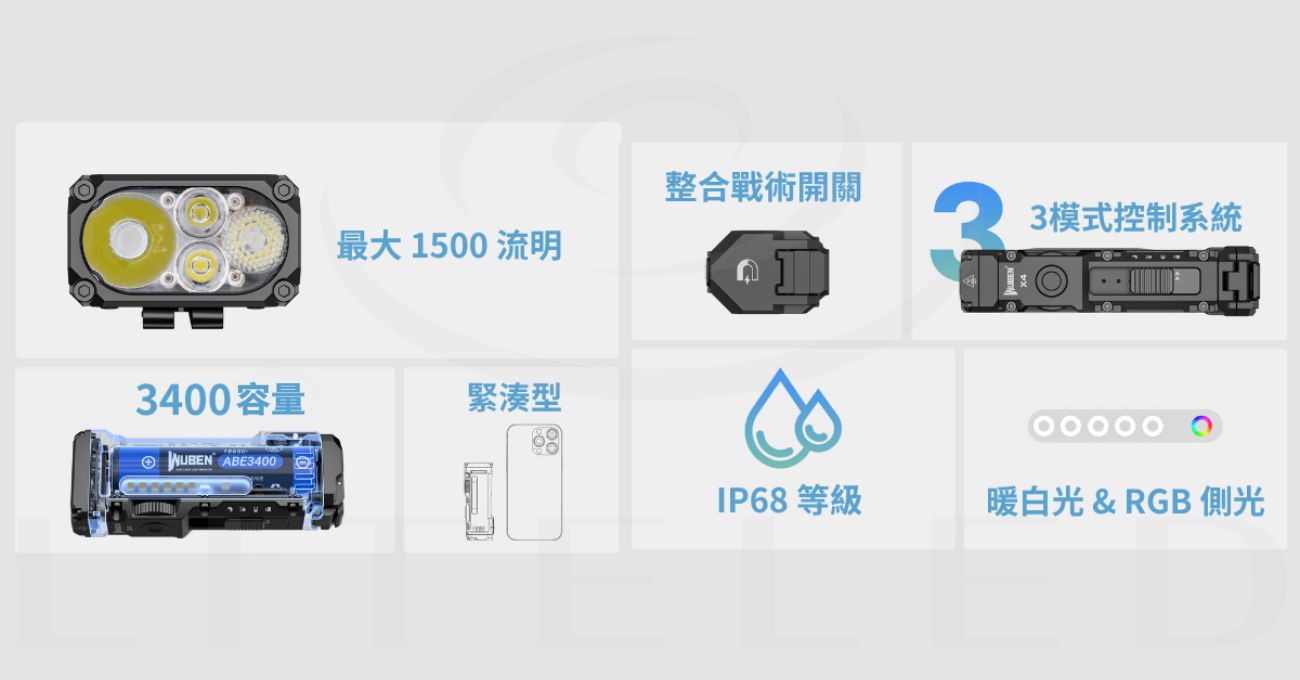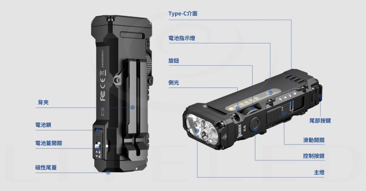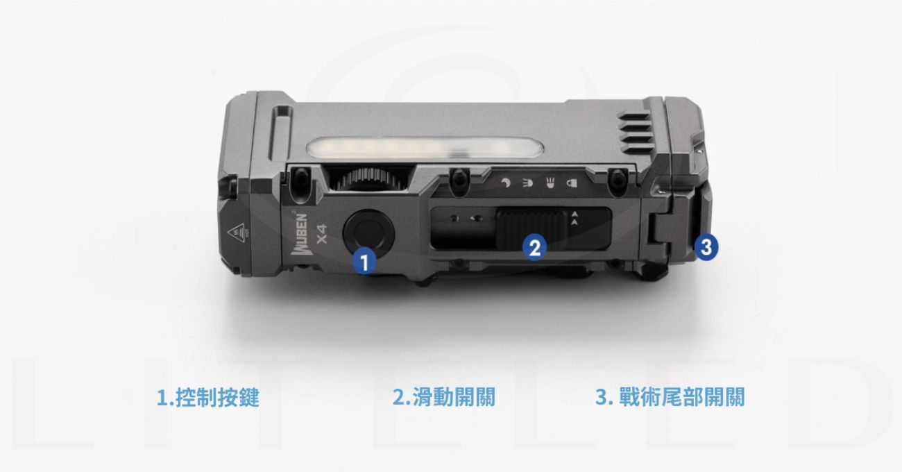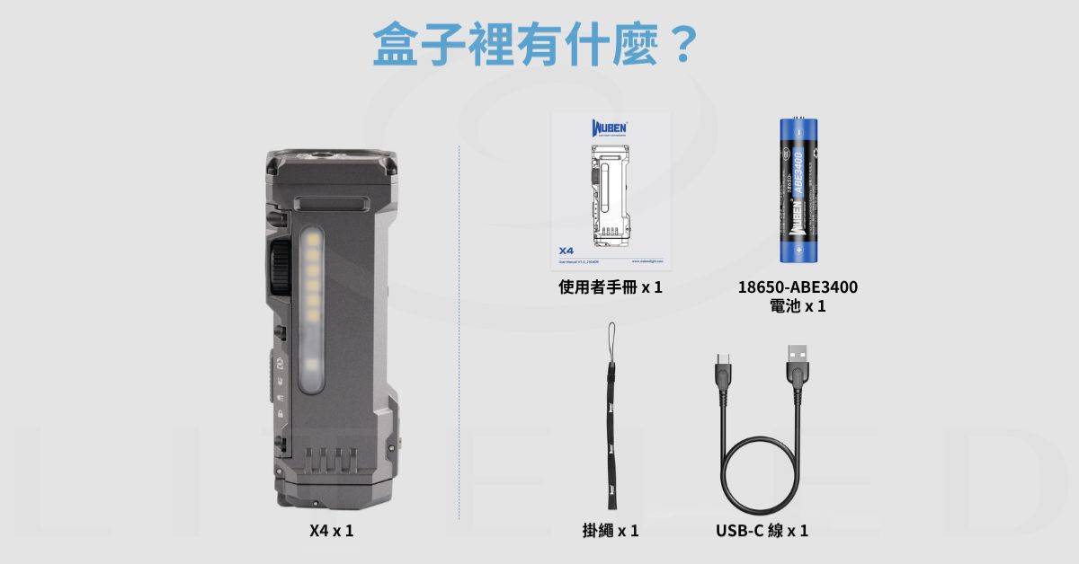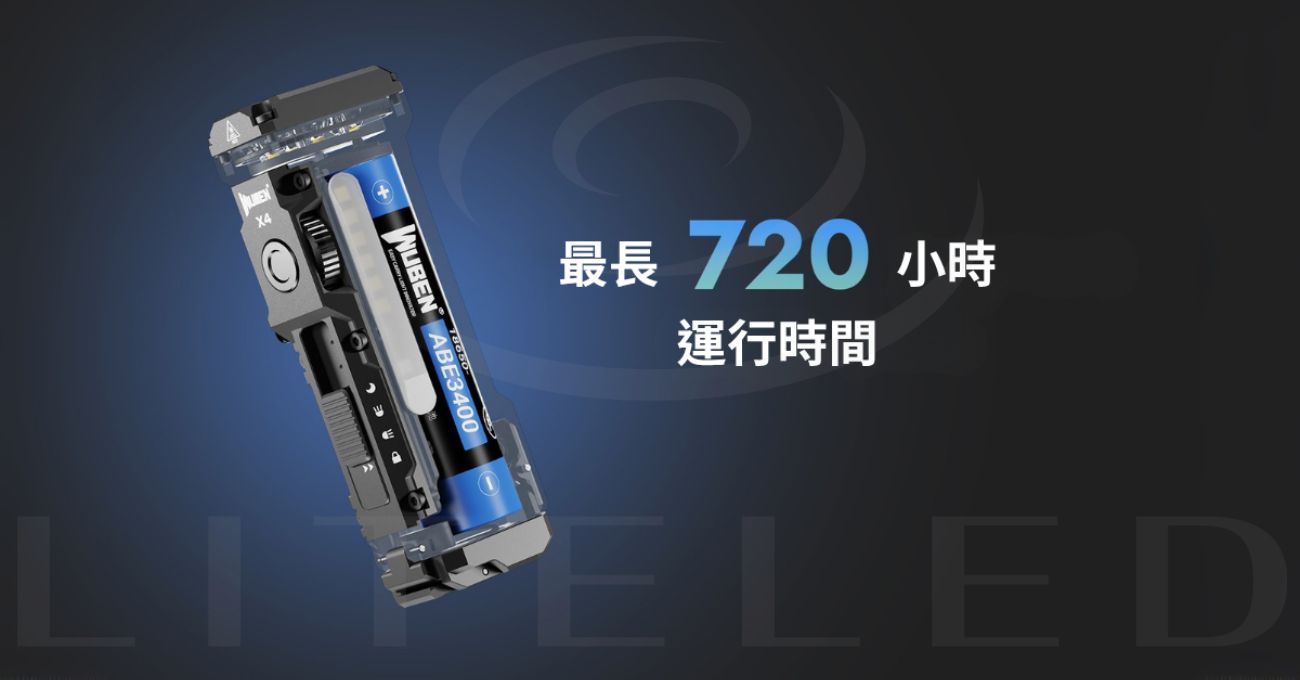 WUBEN X4 專為兼顧功率和便攜性的用戶打造,配備高性能主燈、多功能側燈和集成尾部開關,所有功能均由可更換的 18650 電池供電。其雙光束燈頭、精準的滑動控制和免持功能,都融入了時尚便攜的設計之中。