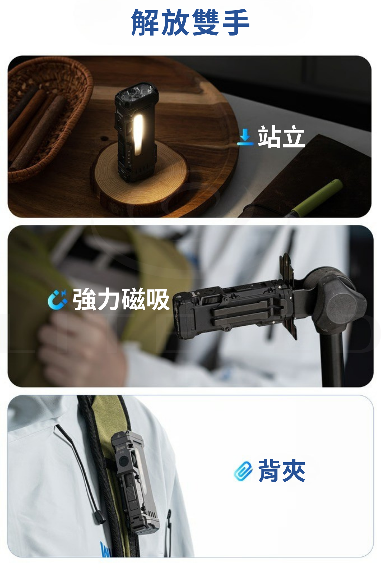 X4 以便攜性和易用性為核心,可直立放置,磁吸式吸附於金屬表面,並可牢固夾在您的裝備上。無論您是修路、徒步,還是需要解放雙手,X4 都能隨時待命——輕鬆便捷,毫不妥協。