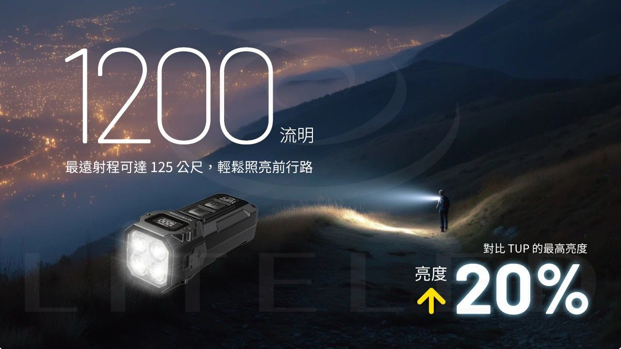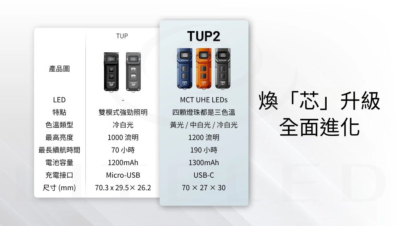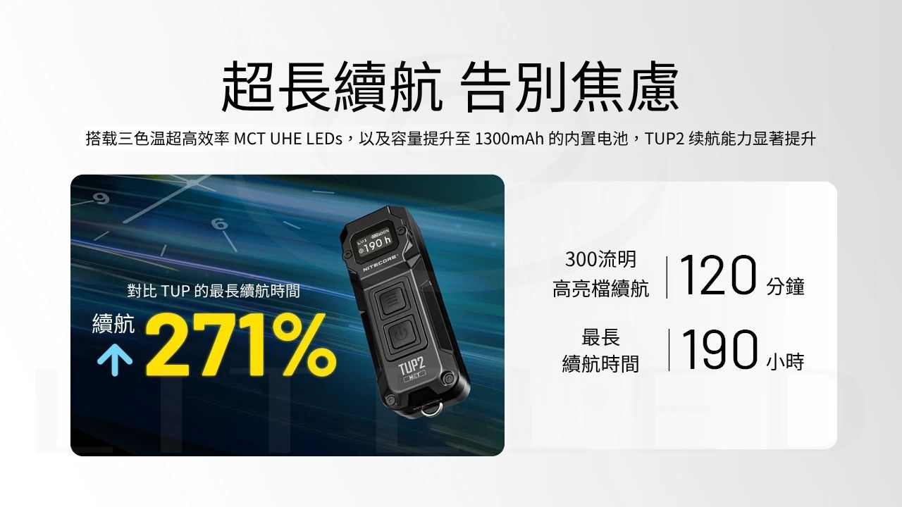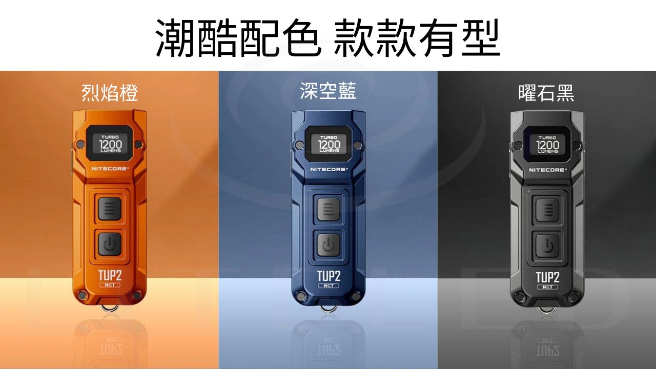 TUP2 多色溫智能鑰匙燈,搭載4顆四核心多色溫MCT UHE LEDs帶來三色溫光源隨心切換,1200流明與125米遠射的超級性能表現,190小時長續航搭配高清顯示螢幕,集高科技與高性能於一體。