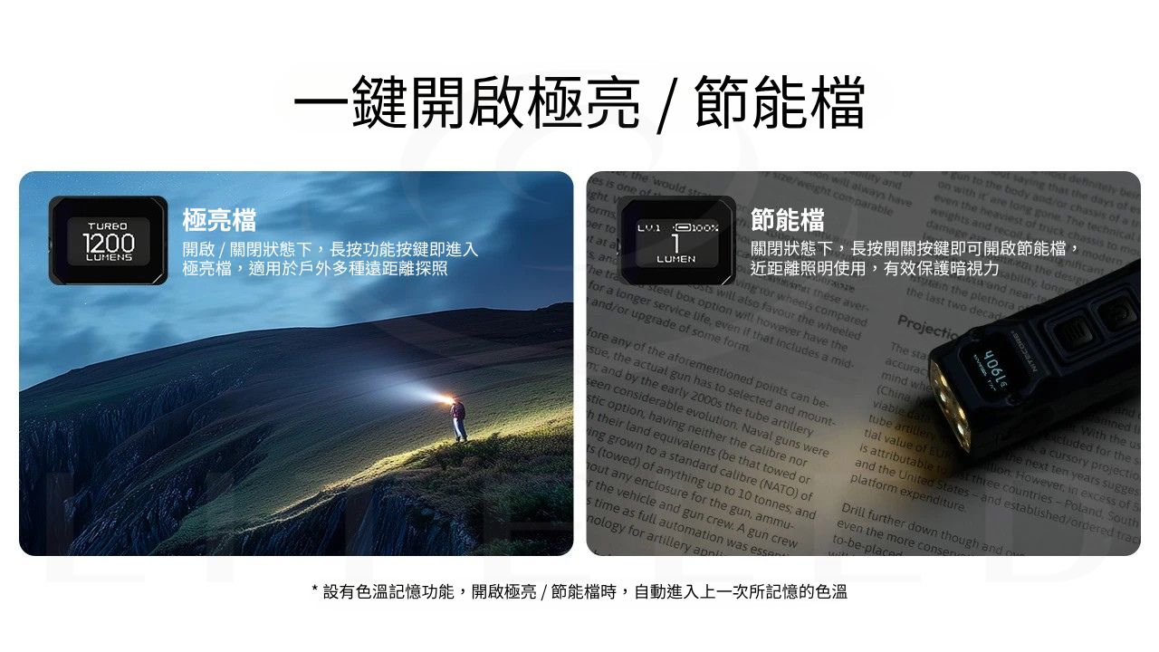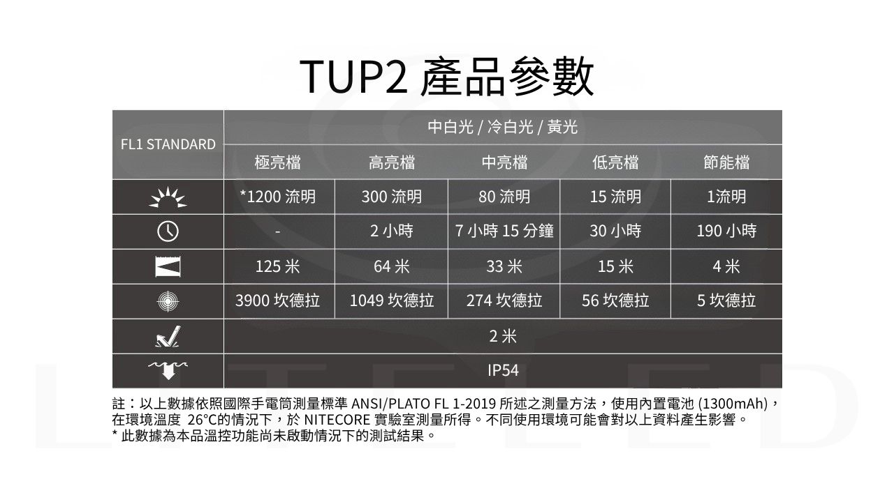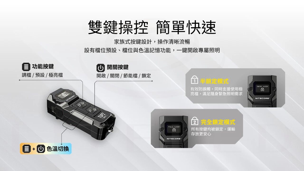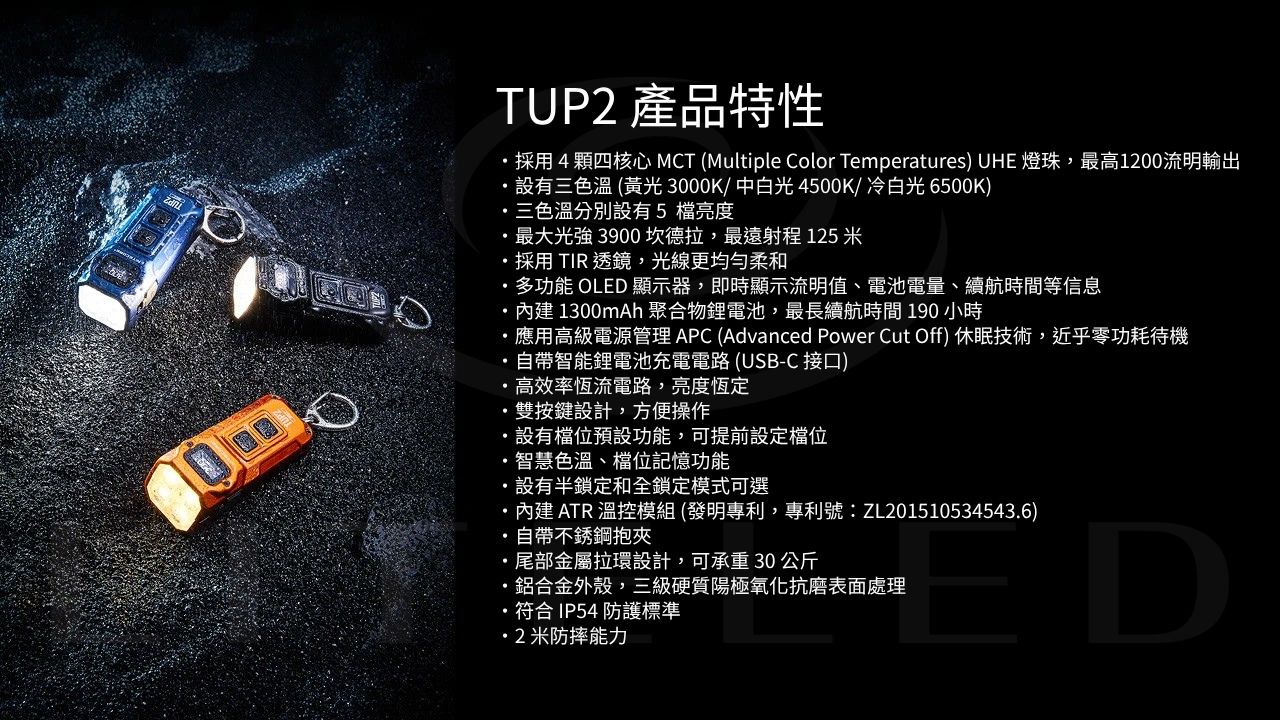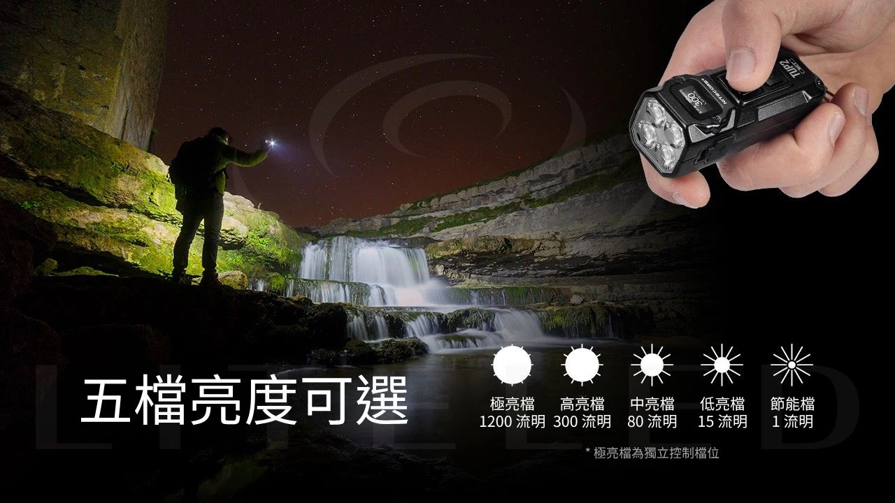 TUP2 多色溫智能鑰匙燈,搭載4顆四核心多色溫MCT UHE LEDs帶來三色溫光源隨心切換,1200流明與125米遠射的超級性能表現,190小時長續航搭配高清顯示螢幕,集高科技與高性能於一體。