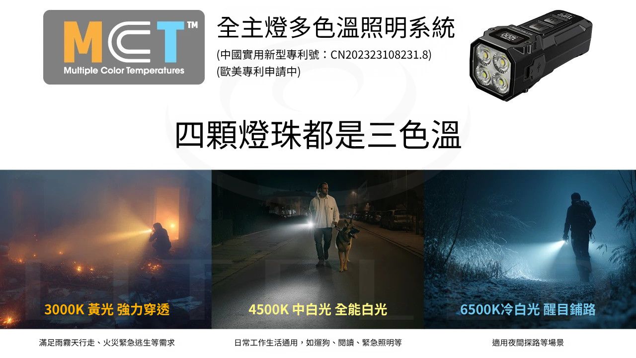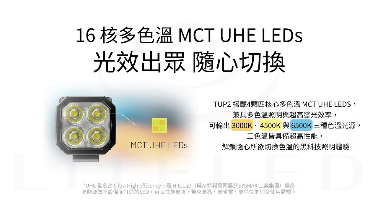 TUP2 搭載4顆四核心多色溫MCT UHE LEDs,兼具多色溫照明與超高發光效率,解鎖隨心切換3000K黃光、4500K中白光和6500K冷白光三種色溫光源的黑科技照明體驗,更有2米防摔能力與IP54防塵防水等級,輕鬆滿足雨霧天行走、火災應急逃生、遛狗、夜間探路等場景使用。