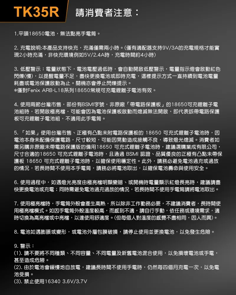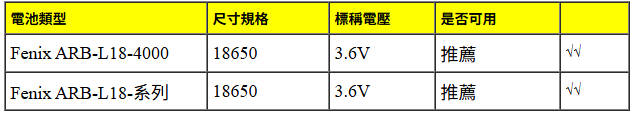 *僅對Fenix ARB-L18系列18650常規可充電鋰離子電池有效。