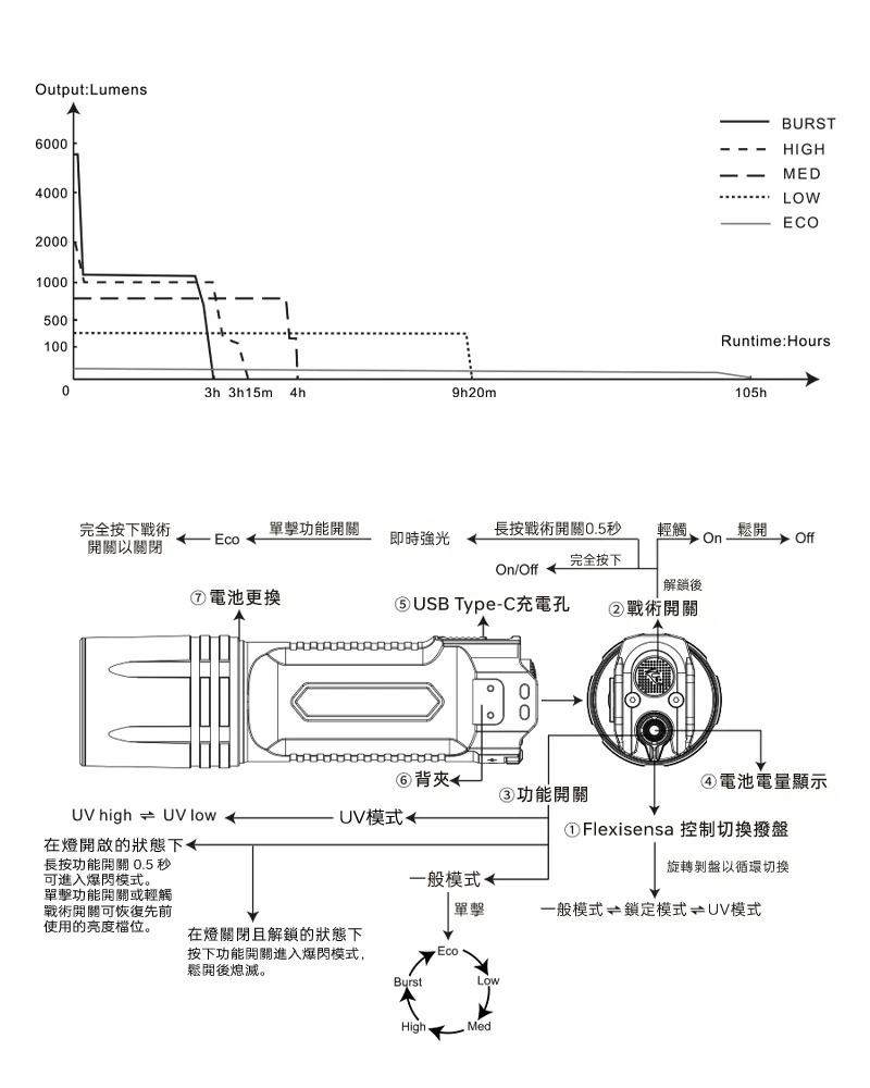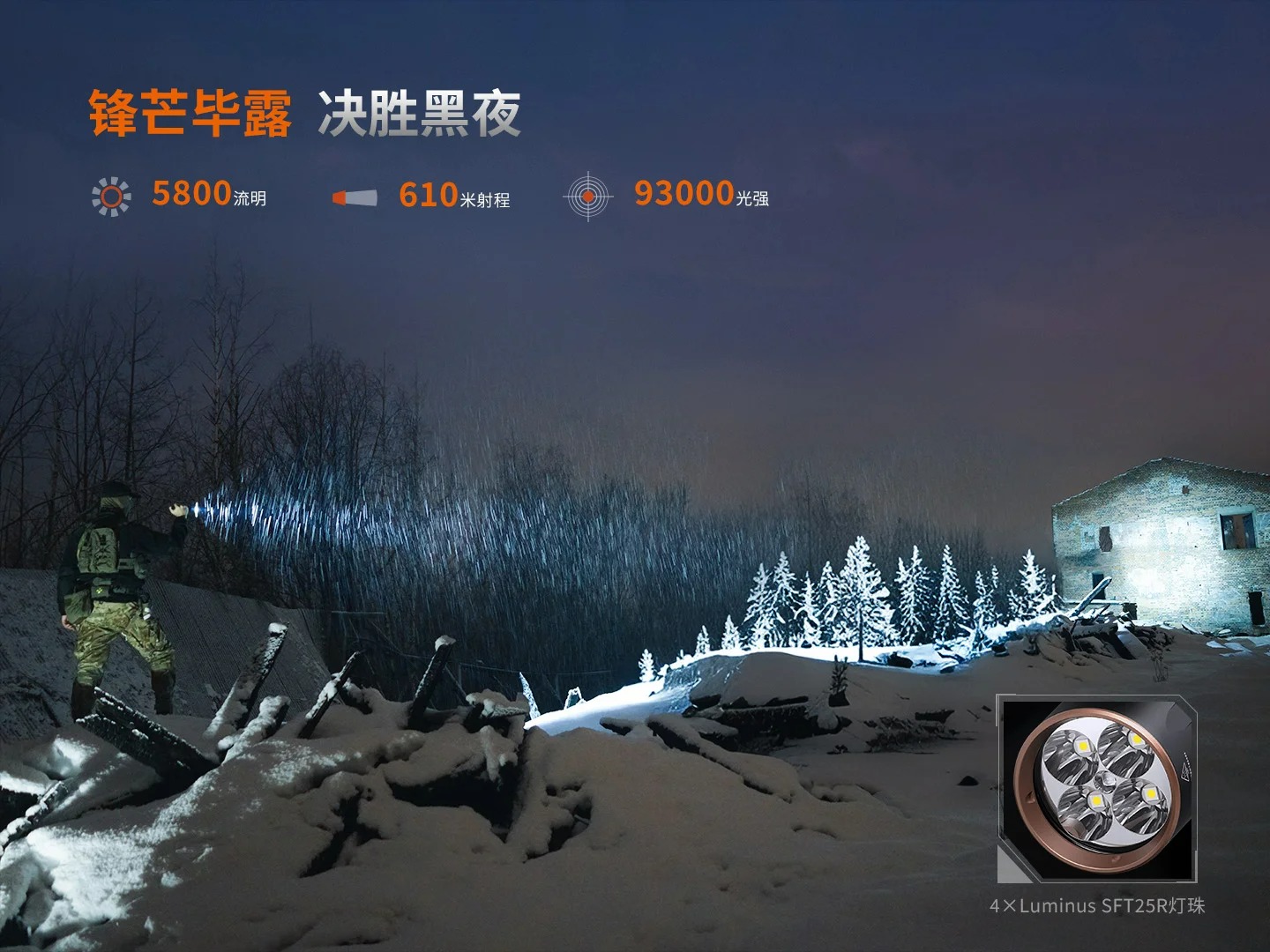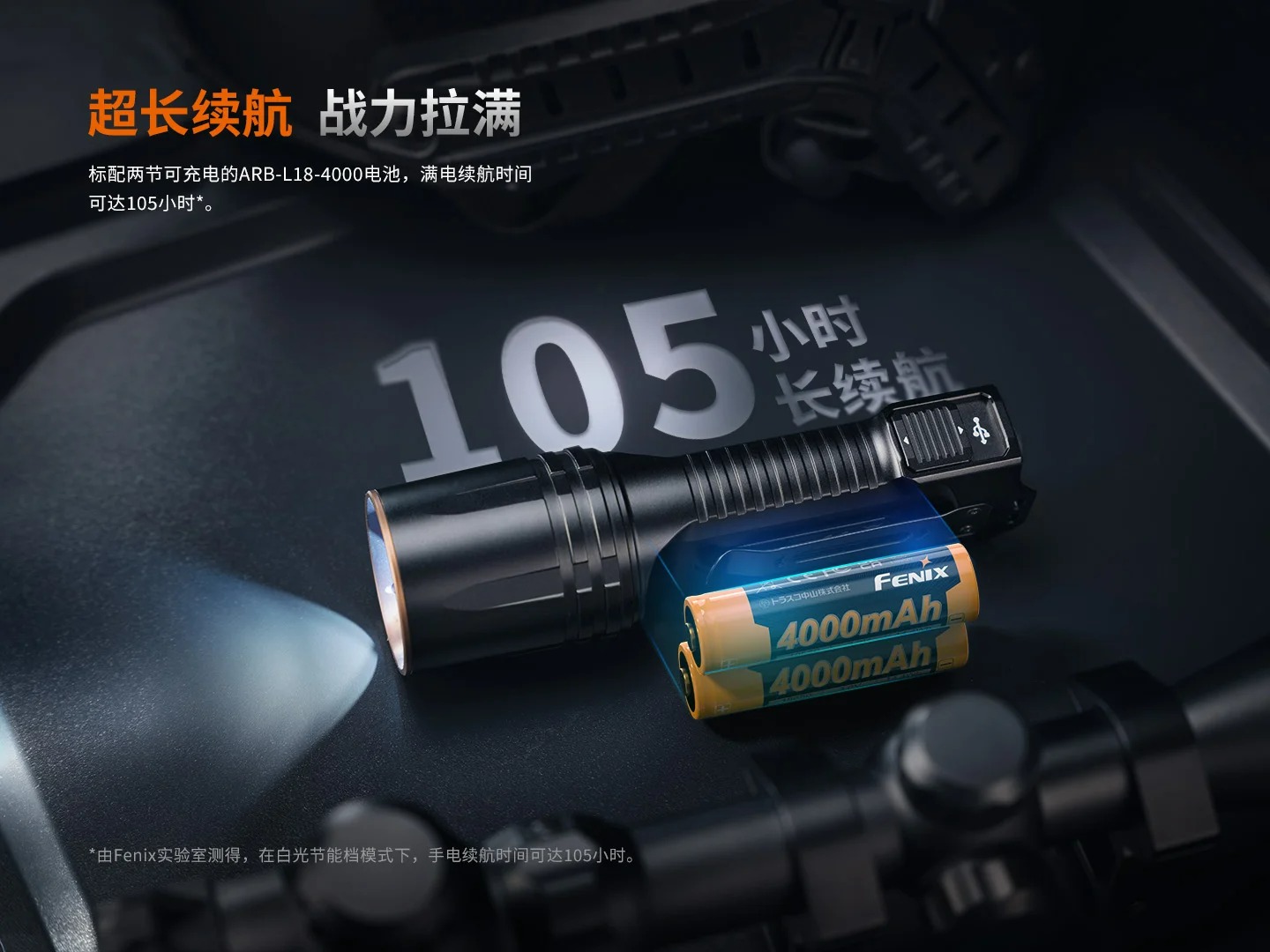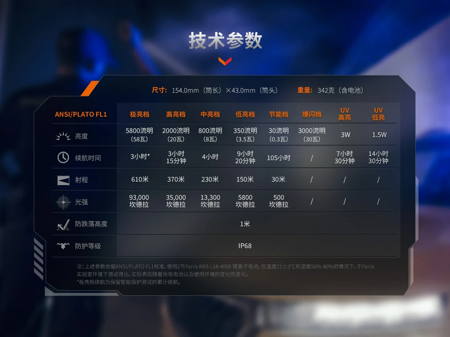 注:上述參數依據ANSI/PLATO FL1標準,使用2節Fenix ARB-L18-4000 鋰離子電池,在溫度21±3℃和濕度50%-80%的情況下,於Fenix實驗室環境下測試得出。實際表現隨著供電電池以及使用環境的變化而變化。 *極亮檔續航為保留智能保護測試的累計續航。