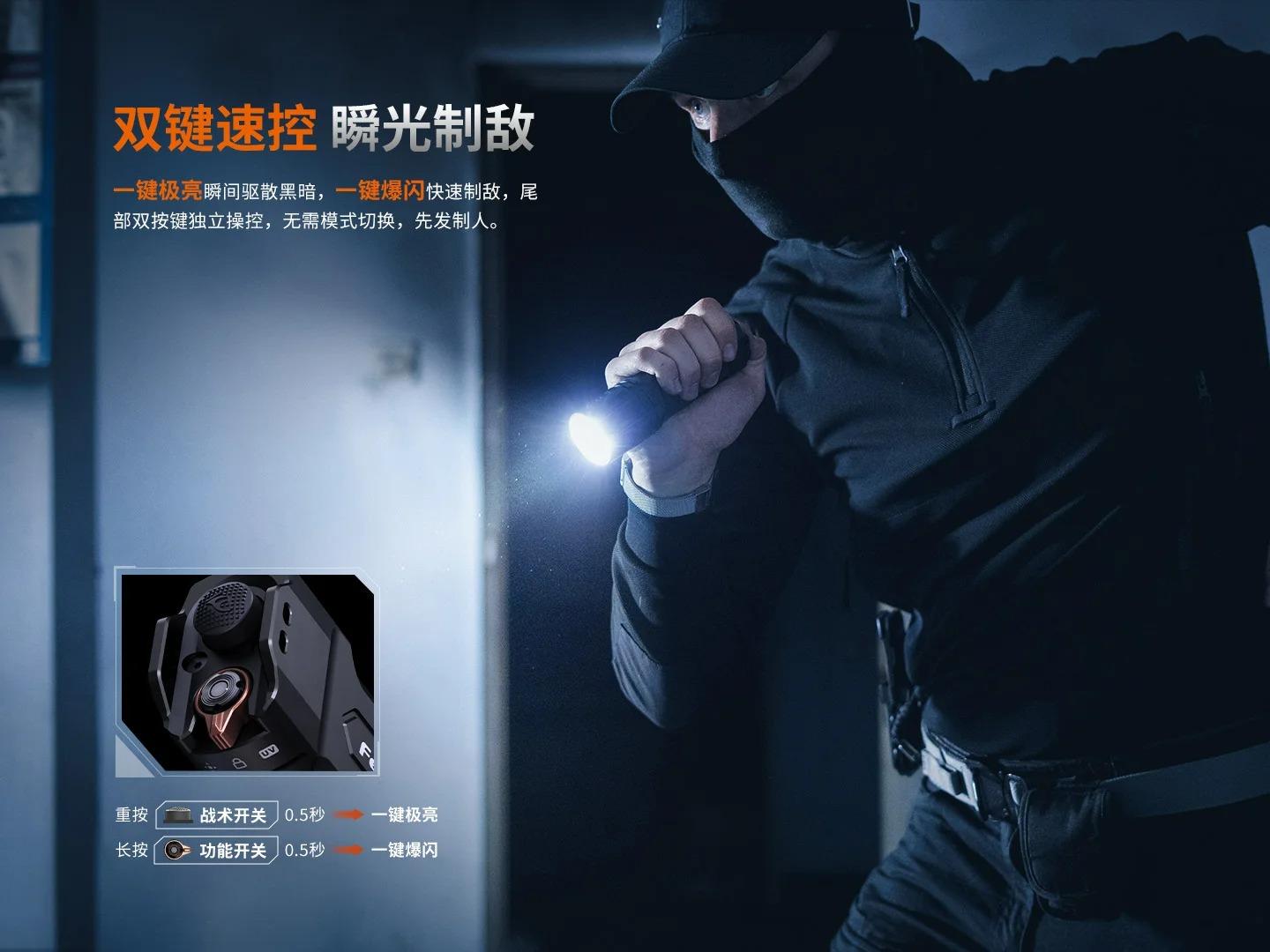 ◎尾部採用靜音戰術雙開關,具備一鍵爆閃、一鍵極亮功能;