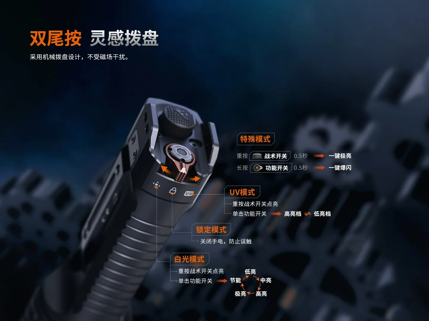 任意狀態下,可通過撥動尾部撥盤至對應位置進行模式切換,從左到右依次為照明模式,鎖定關閉模式,UV模式(以筒頭朝下,撥盤指標指向自己時的視角為准)。