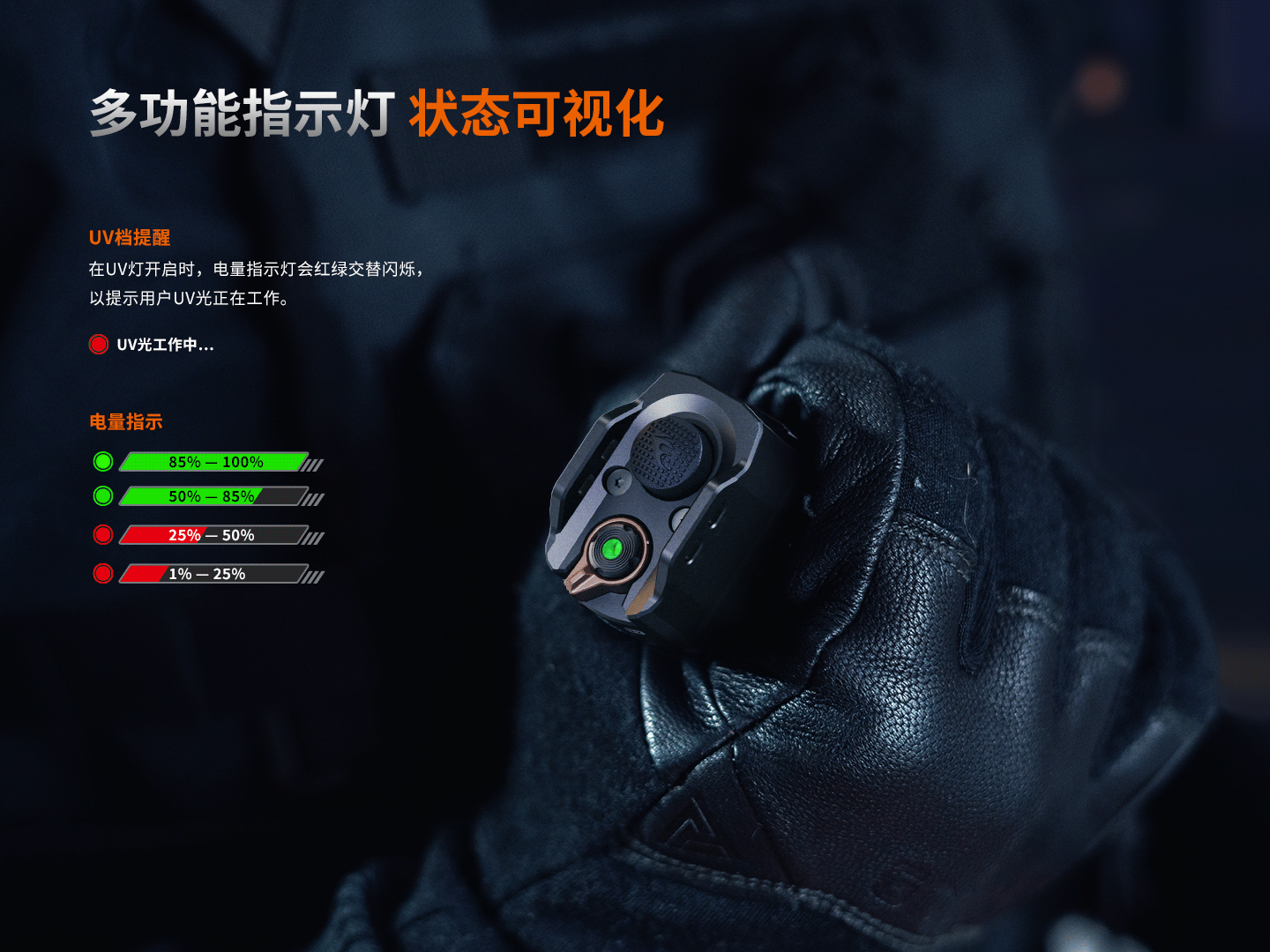 備註:由於UV燈可見光較少,在亮度足夠的環境不容易發現UV燈亮起,為避免由於UV燈開啟而造成不必要的危險或損失,在UV燈開啟時,位於筒尾的電量指示燈會紅綠交替閃爍,以提示用戶UV燈正在開啟。