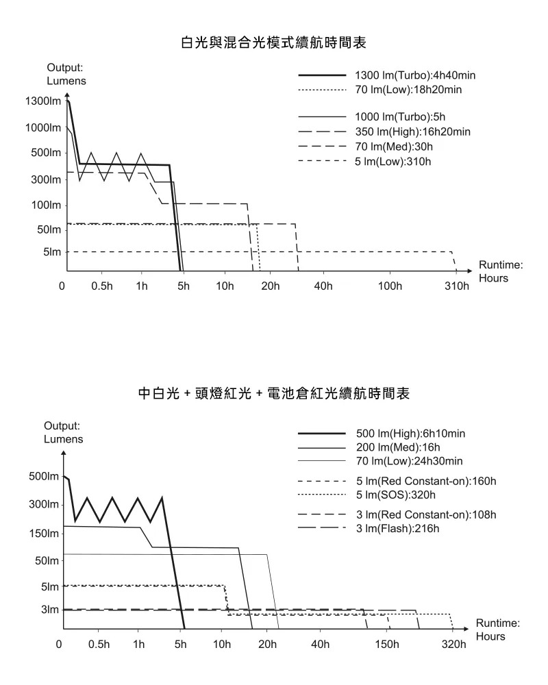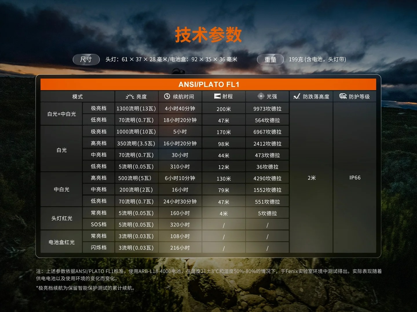 注:上述參數依據ANSI/PLATO FL1標準,使用ARB-L18-4000電池,在溫度21±3℃和濕度50%-80%的情況下,於Fenix實驗室環境中測試得出。實際表現隨著供電電池以及使用環境的變化而變化。