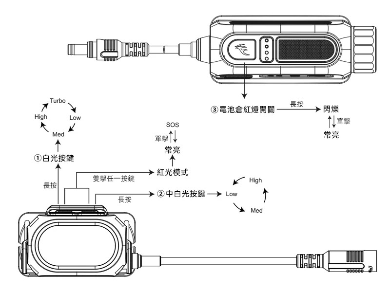開機:關機狀態下長按按鍵1或2,可分別開啟白光或中白光模式。