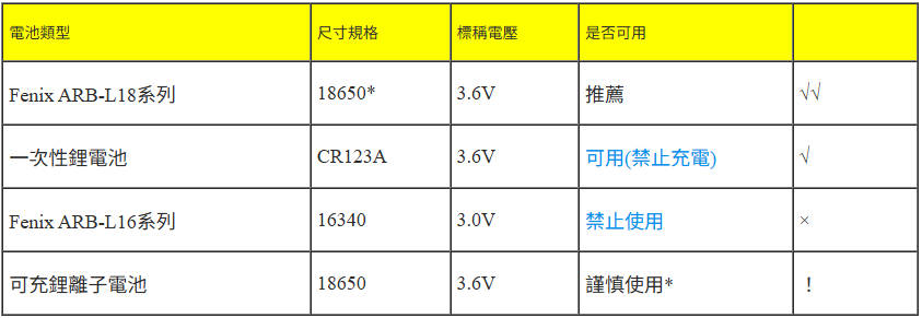 *18650可充鋰離子(Li-ion)電池屬於工業電芯,並非有安全保障的民用電池,當電池品質不良或者使用不當(短路、高溫等等)時可能發生燃燒、爆炸並危及人身和財產安全,若使用此電池種類應明白其中的風險並自願承擔相應的責任。使用品質優秀並帶有保護電路的鋰離子電池會在一定程度上降低風險,推薦使用Fenix ARB-L18系列電池。