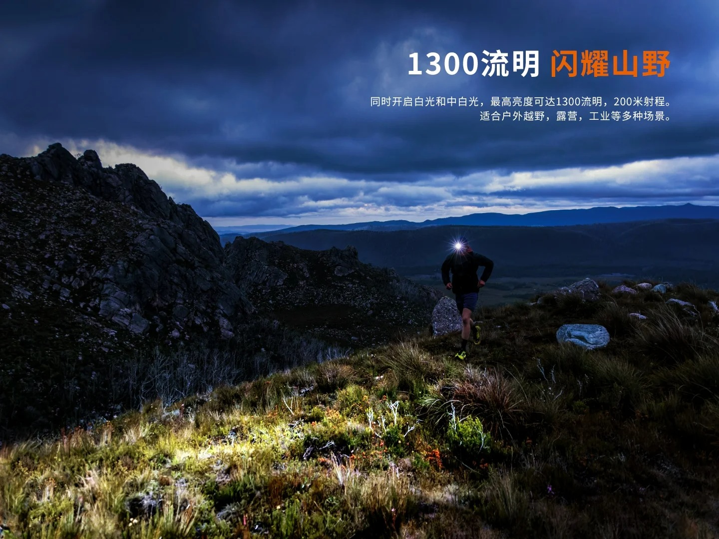 2.低壓警示:燈具檢測到電池電壓過低時,將自動逐步降低當前工作檔位,直到降至當前模式的最低亮檔位,雙光源同時開啟的狀態下,將自動關閉中白光,僅保留白光低亮檔;中白光模式的狀態下,將自動關閉中白光,並開啟白光低亮檔,若在最低亮度檔位時,電池電壓仍過低,頭燈將以白光低亮檔每5分鐘閃爍3次,以提醒用戶及時充電或更換電池。