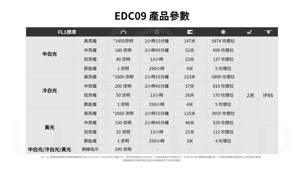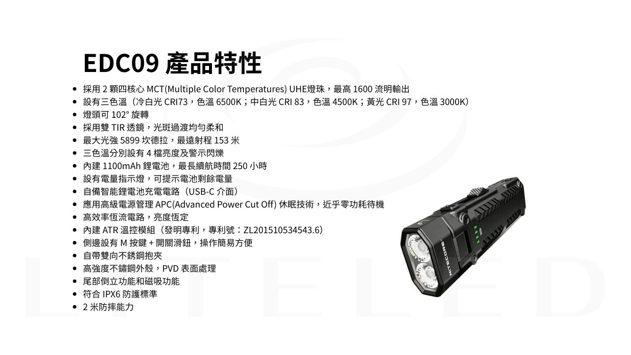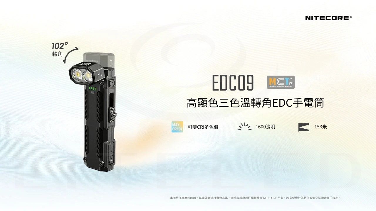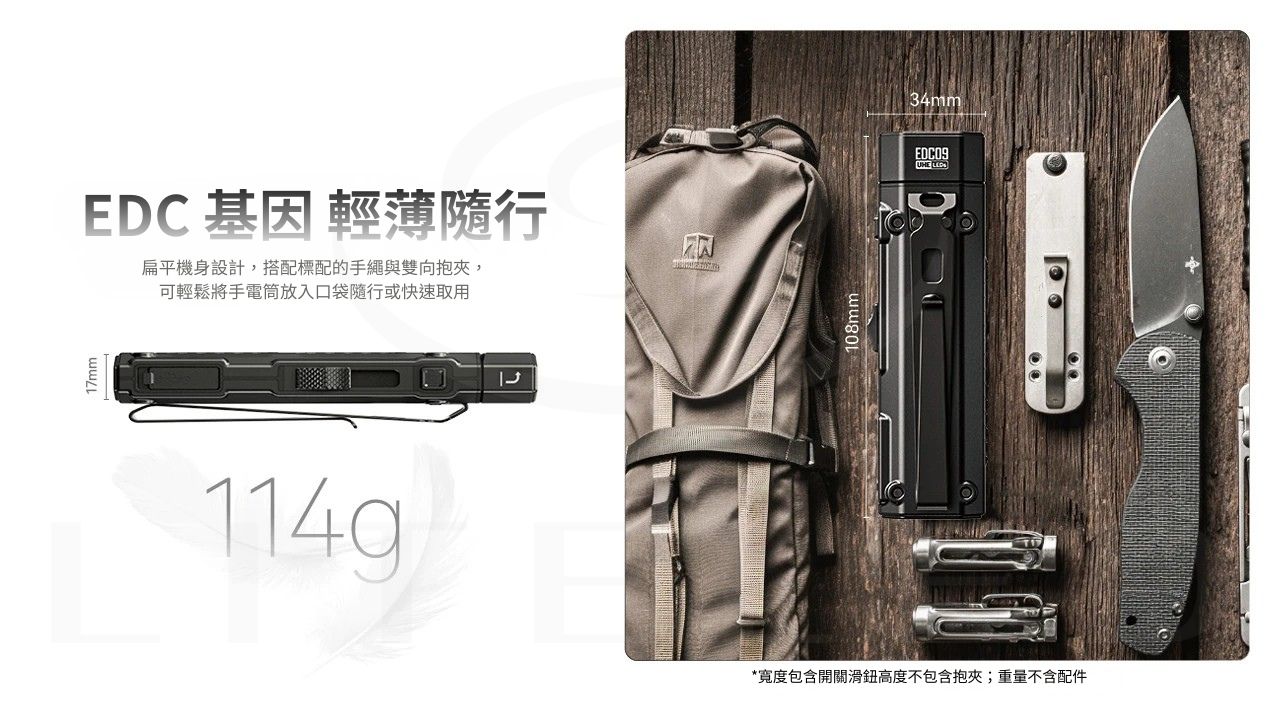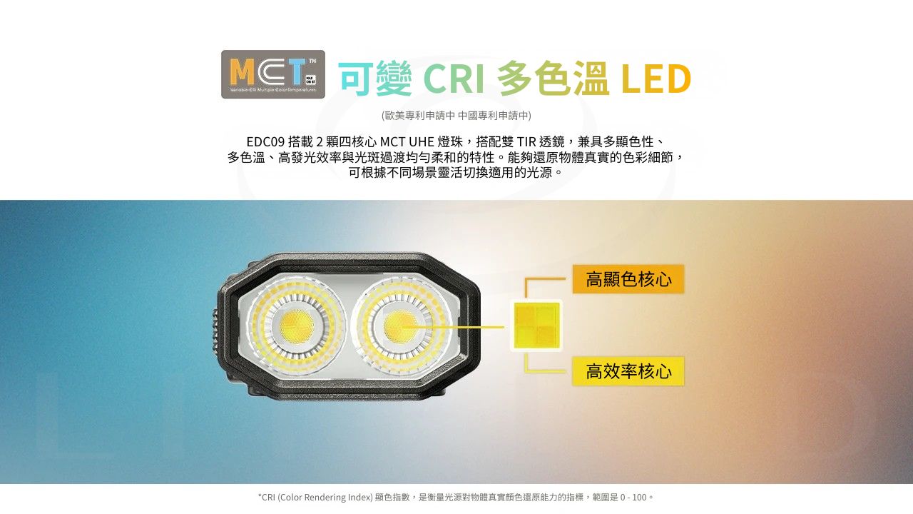 EDC09 搭載2顆四核心MCT UHE燈珠,搭配雙TIR透鏡,兼具多顯色性、多色溫、高發光效率與光斑過渡均勻柔和的特性。能夠還原物體真實的色彩細節,可根據不同使用場景靈活切換適用的光源,一燈多用,功能全面。