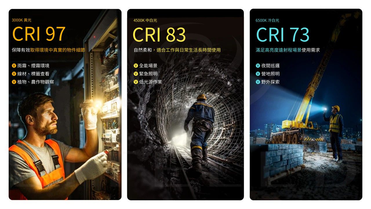 色溫類型:3000K黃光 CRI 97, 4500K中白光 CRI 83, 6500K冷白光 CRI 73