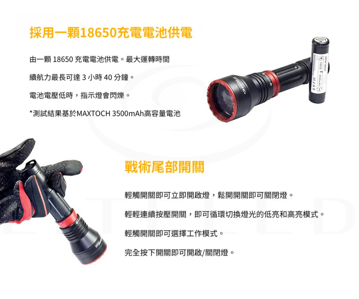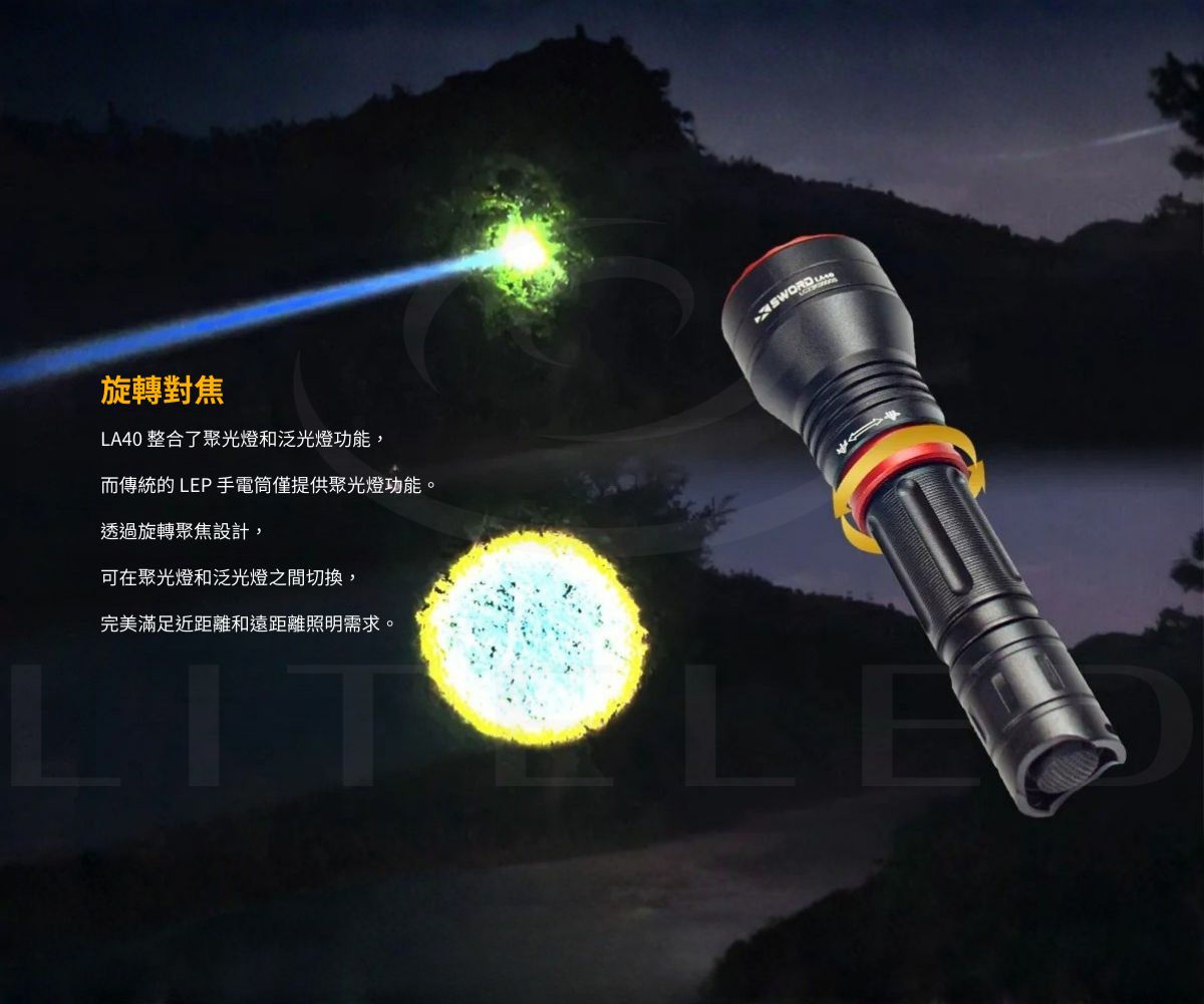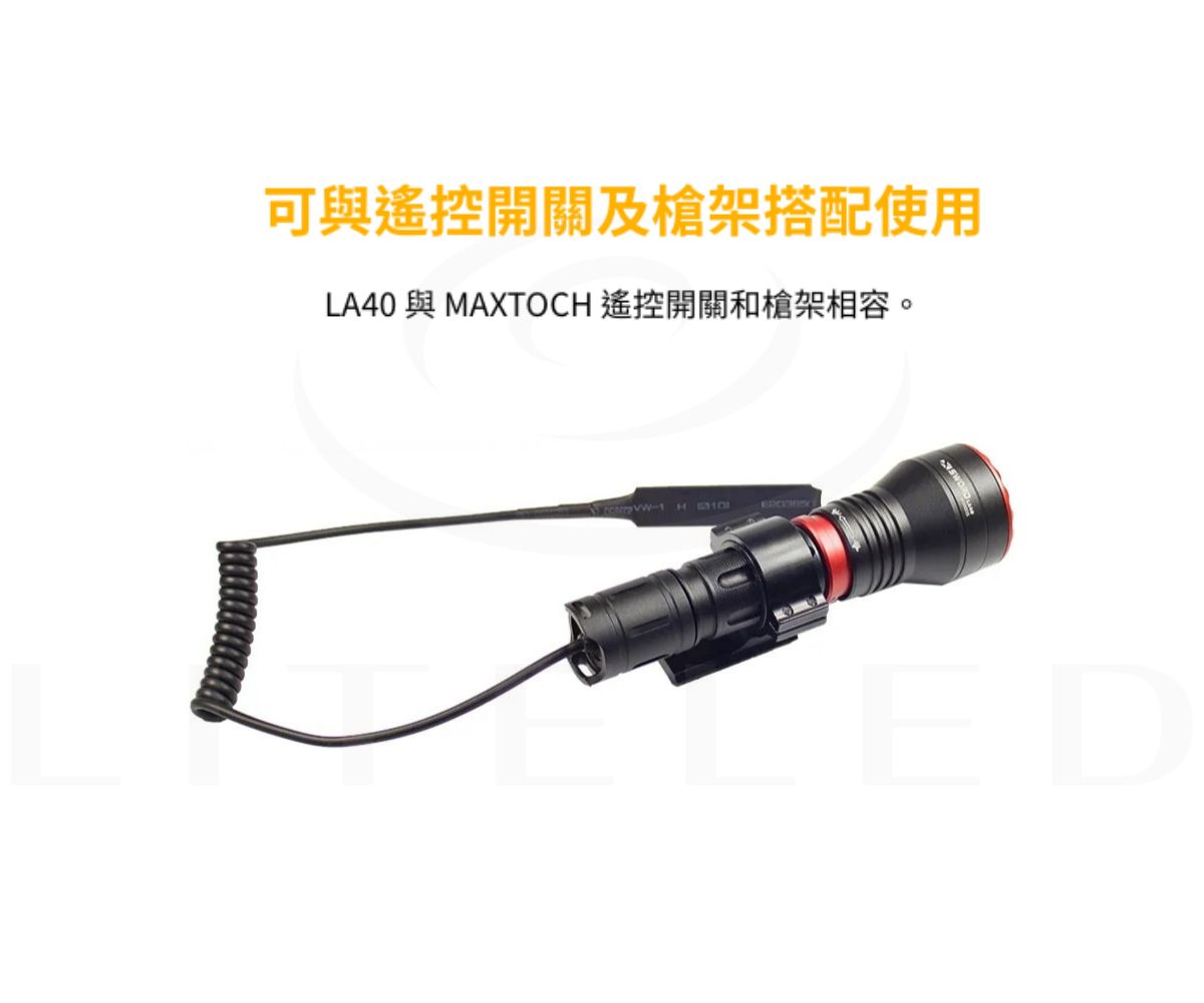 LA40 專為實戰與戶外需求設計,支援輕鬆的單手操作,並配備直觀的低電量提醒功能。其標誌性的紅色旋轉環讓您能流暢地在「聚光(Spotlight)」與「泛光(Floodlight)」之間切換,滿足不同環境的照明需求。搭載 MAXTOCH 特製 LEP 光源,並由單顆 18650 電池驅動,LA40 是軍警勤務、搜救及戶外探險中無可取代的專業選擇。