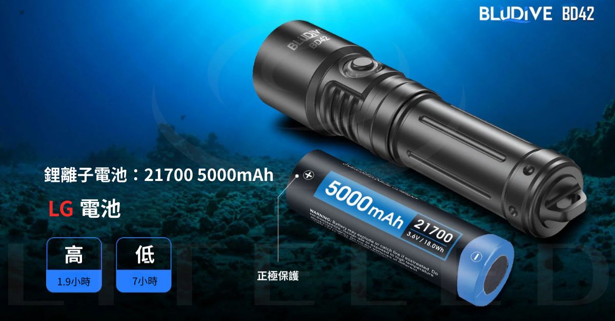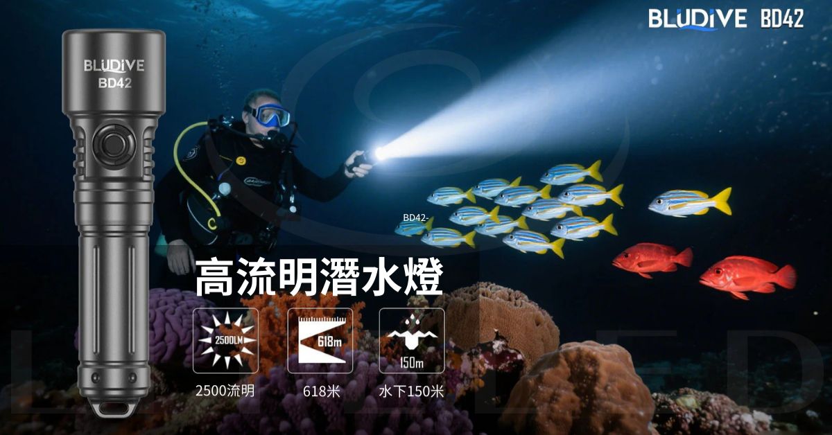 Bludive BD42 是一款高性能 LED 潛水手電筒,最大亮度可達 2500 流明,採用進口 Luminus SFT42R LED。 SMO 反射器可發出 4 度角的集中光束。使用者可透過按下不鏽鋼側開關在高亮、低亮和爆閃三種亮度模式之間切換。 BD42 由 21700 鋰電池供電,最長續航時間可達 7 小時。憑藉其堅固的防水結構、緊湊的尺寸和便捷的用戶界面,BD42 非常適合作為休閒潛水的主照明燈,以及深潛/專業潛水的備用照明燈。