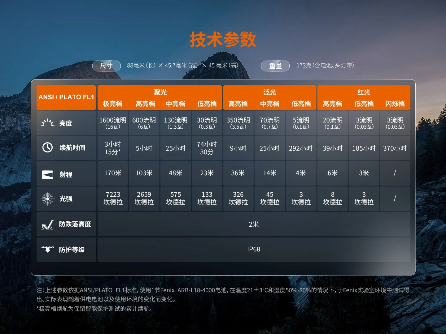 注:上述參數依據ANSI/PLATO FL1標準,使用1節FenixARB-L18-4000電池,在溫度21±3℃和濕度50%-80%的情況下,於Fenix實驗室環境中測試得出。實際表現隨著供電電池以及使用環境的變化而變化。*極亮檔續航為保留智能保護測試的累計續航。