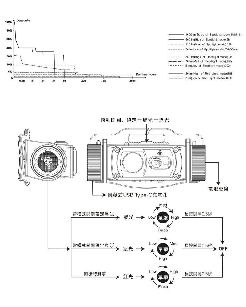 3. 當電池電壓低於3.3V時,頭燈僅各模式低亮檔及紅光閃爍檔可正常使用;