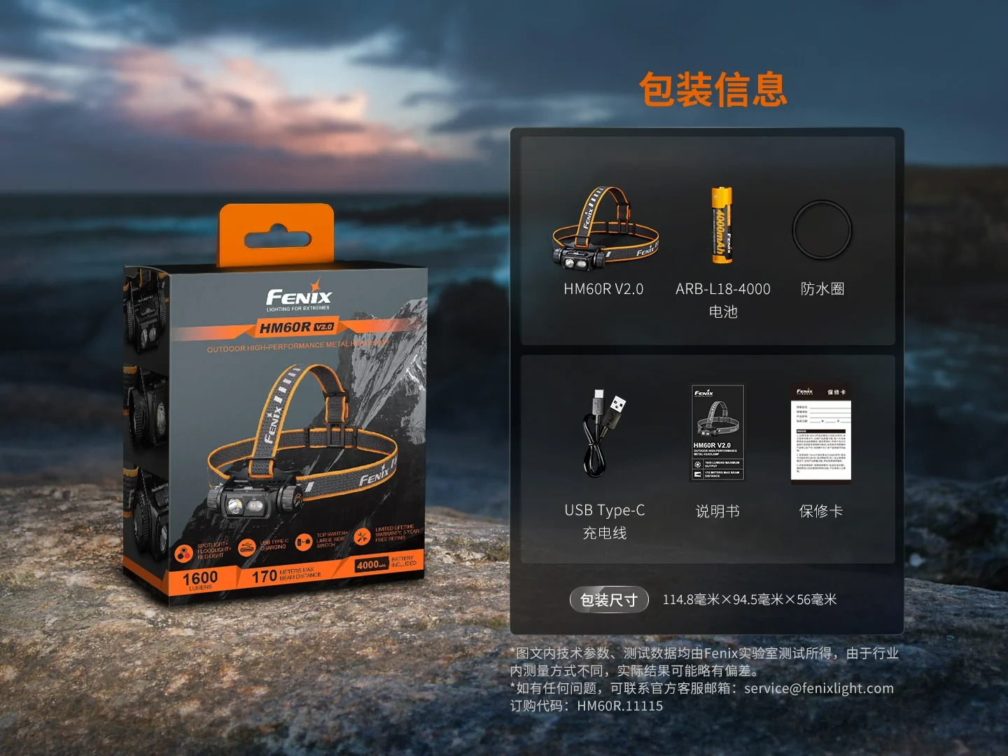 HM60RV2.0頭燈、ARB-L18-4000電池、備用防水圈、USB Type-C充電線、說明書、保修卡。