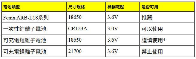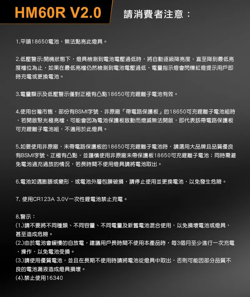 5.如要使用非原廠,未帶電路保護板的18650可充鋰離子電池時,請選用大品牌且品質優良有BSMI字號、正極有凸點,並謹慎使用非原廠未帶保護板18650可充鋰離子電池;同時需避免電池過充過放的情況,若長時間不使用燈具請將電池取出。