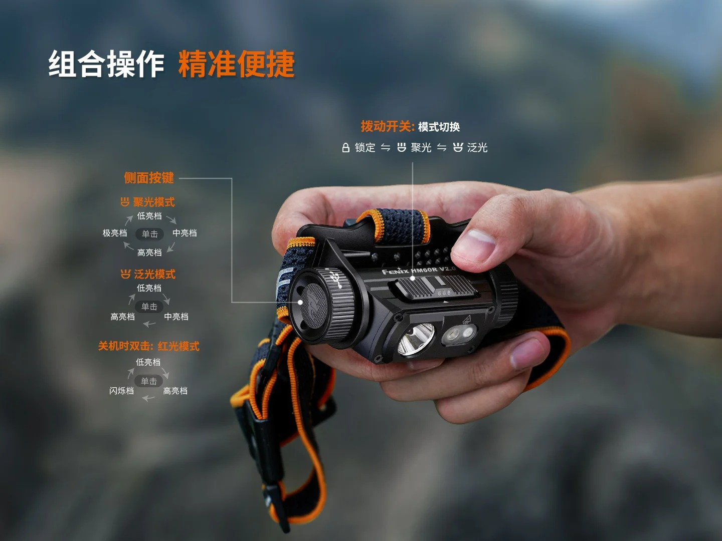 撥動模式開關,頭燈將按照鎖定→聚光→泛光的順序切換模式;