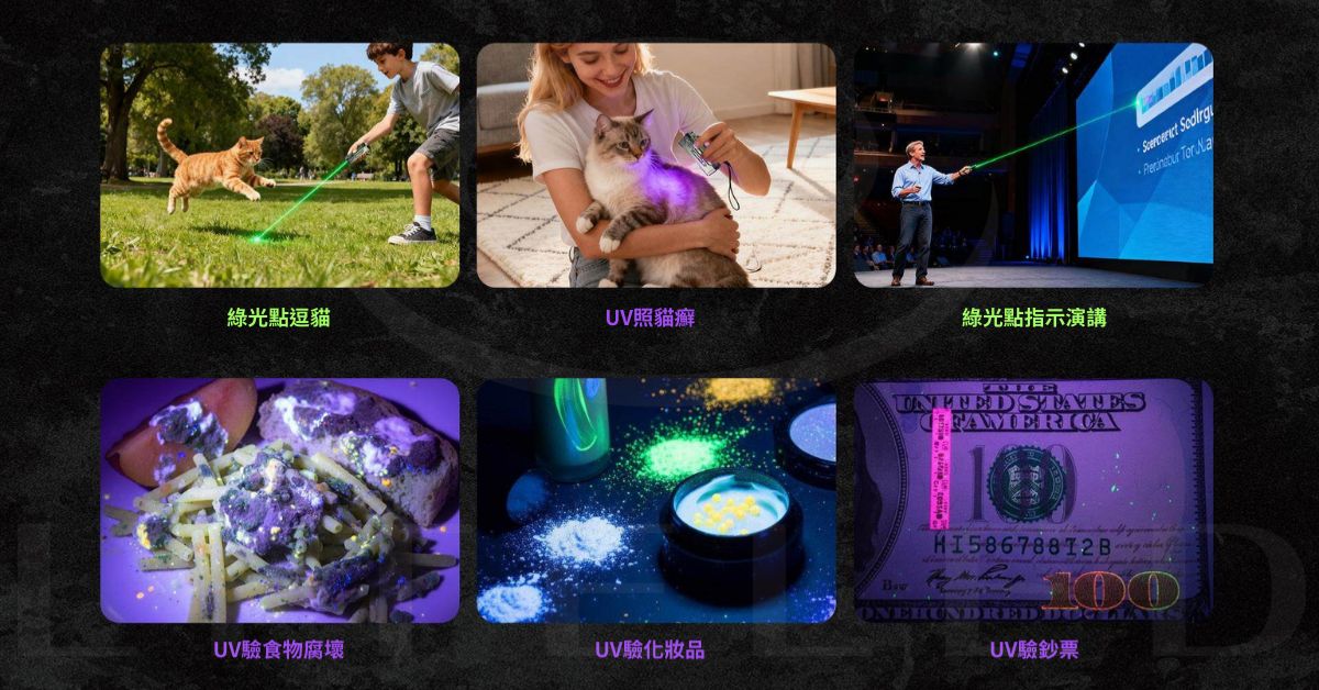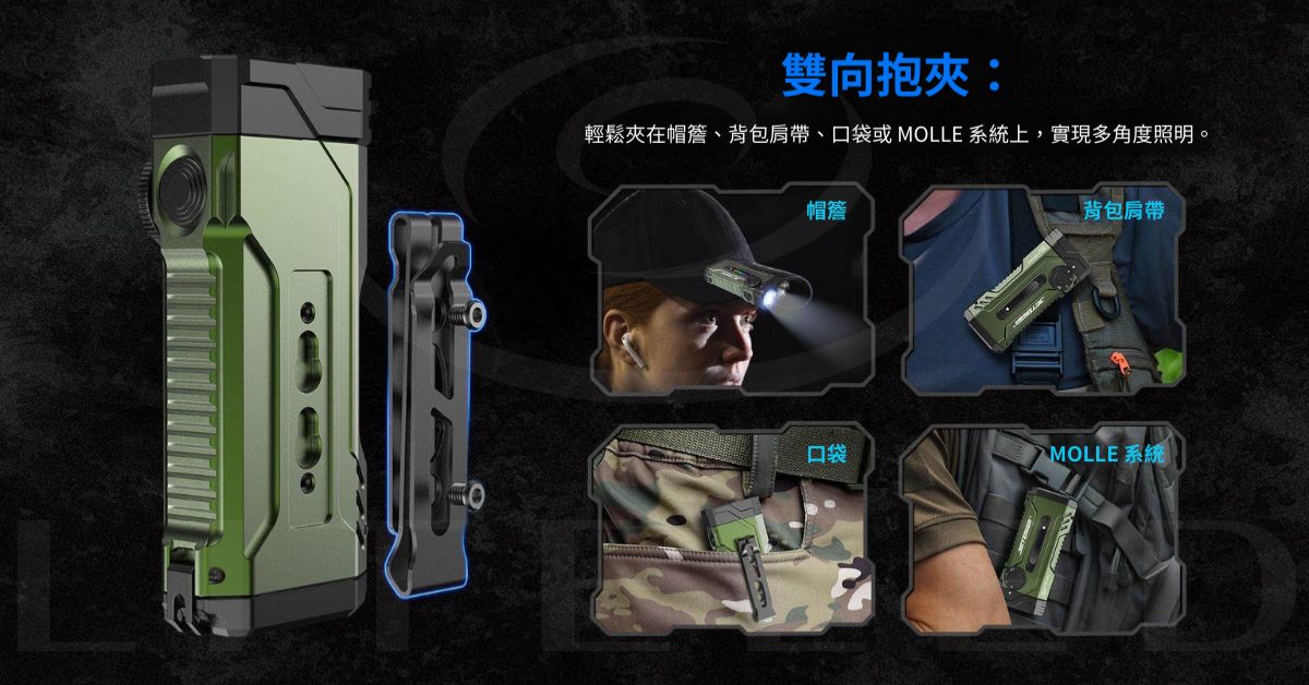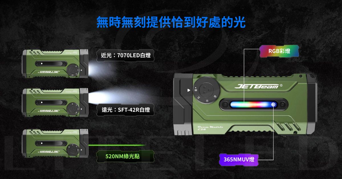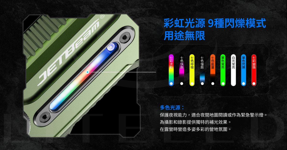 4 合 1 多功能燈:具備標準白光、專用紫外線、綠色雷射和 9 種可自訂 RGB 照明模式(包括紅藍警用閃光燈)。