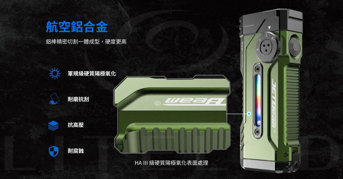 堅固耐用且防水:採用航空級鋁材製成,並經過 III 型硬質陽極處理。它具有 1.5 公尺抗跌落性能和 IPX-8 防水等級(可在 2 公尺深的水下浸泡)。
