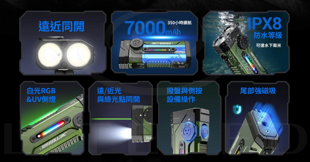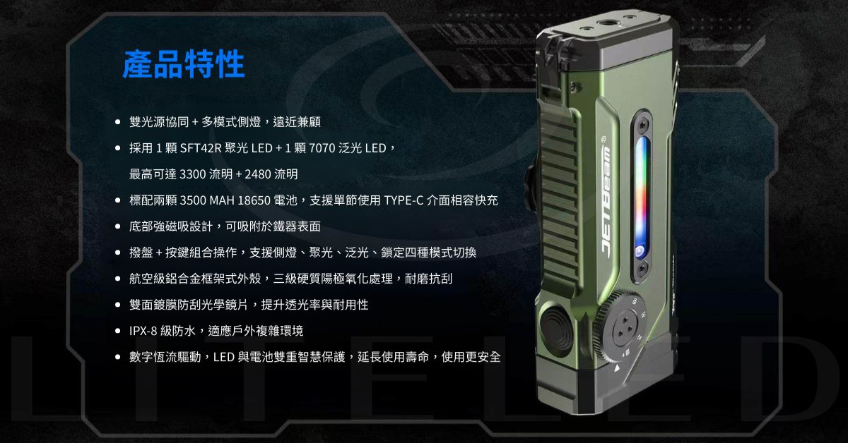 LED燈珠:泛光模式採用 7070 LED;聚光模式採用 SFT-42R LED