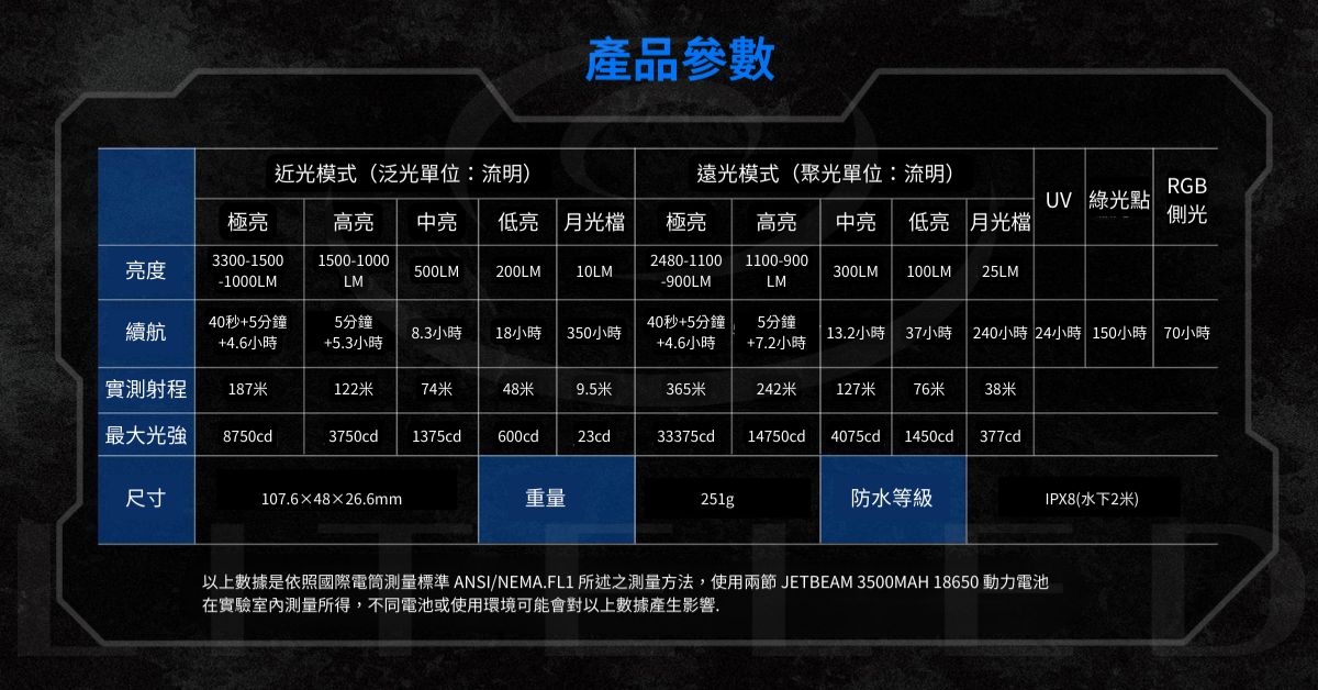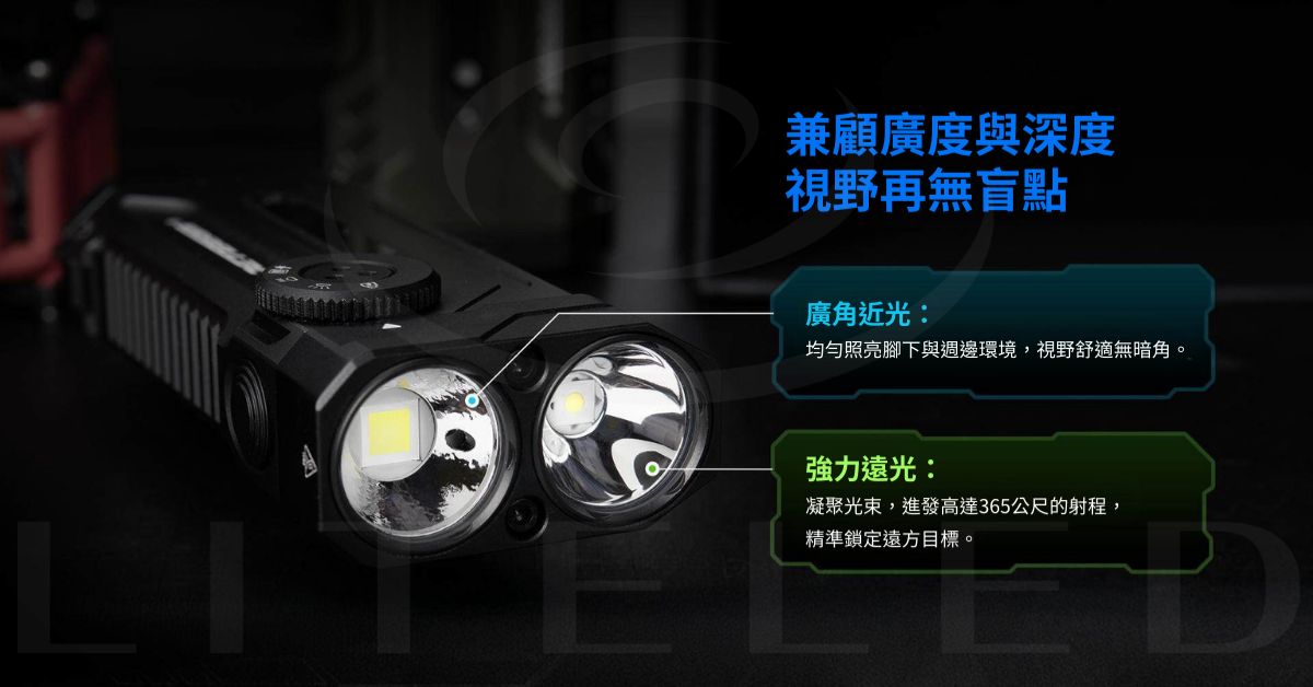 最大照射距離:泛光模式 187 公尺;聚光模式 365 公尺